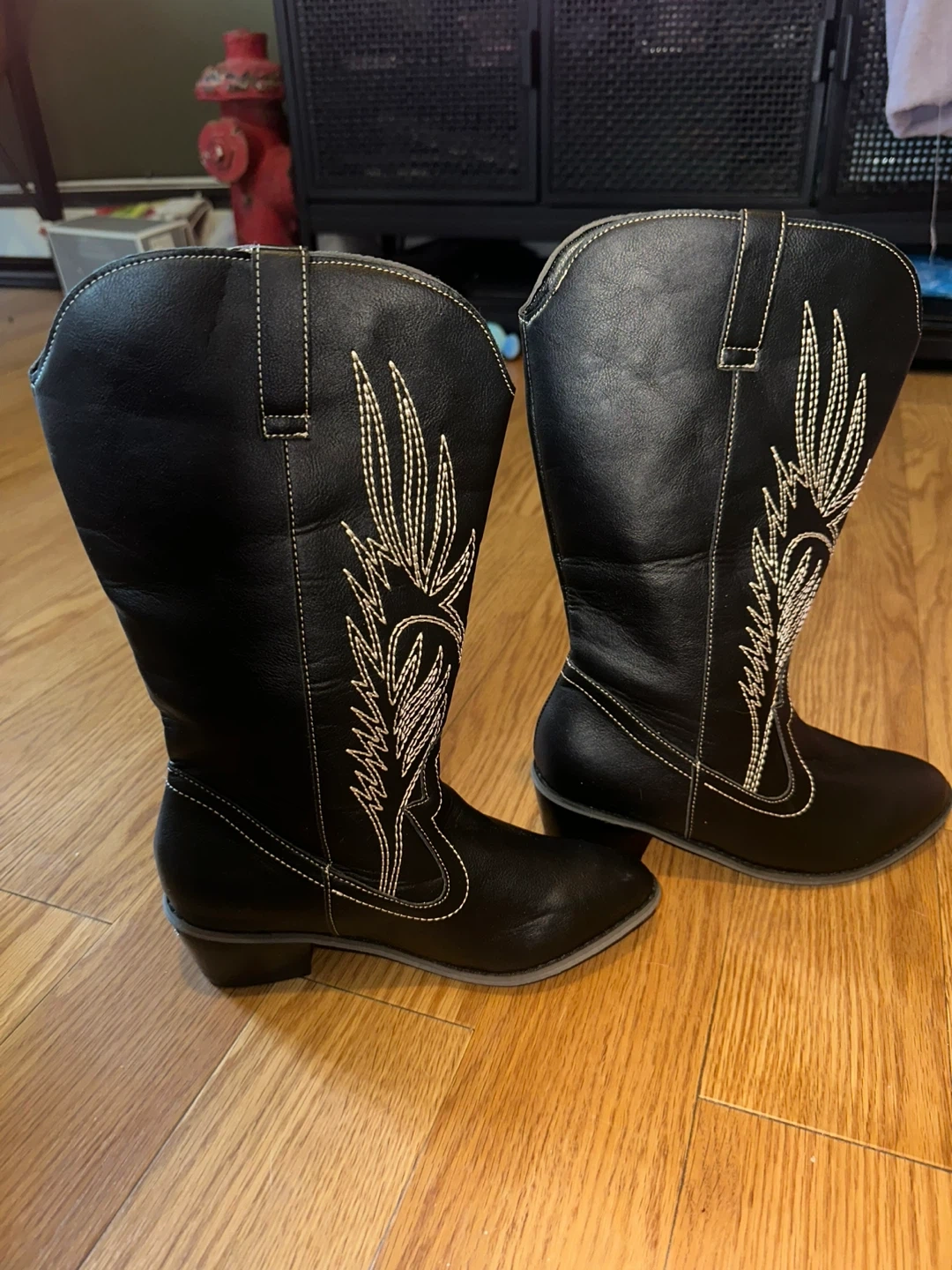 These black cowboy boots feature intricate white stitching details on the shaft and vamp. They have a classic Western silhouette with a comfortable block heel. Perfect for adding a touch of country style to any outfit!