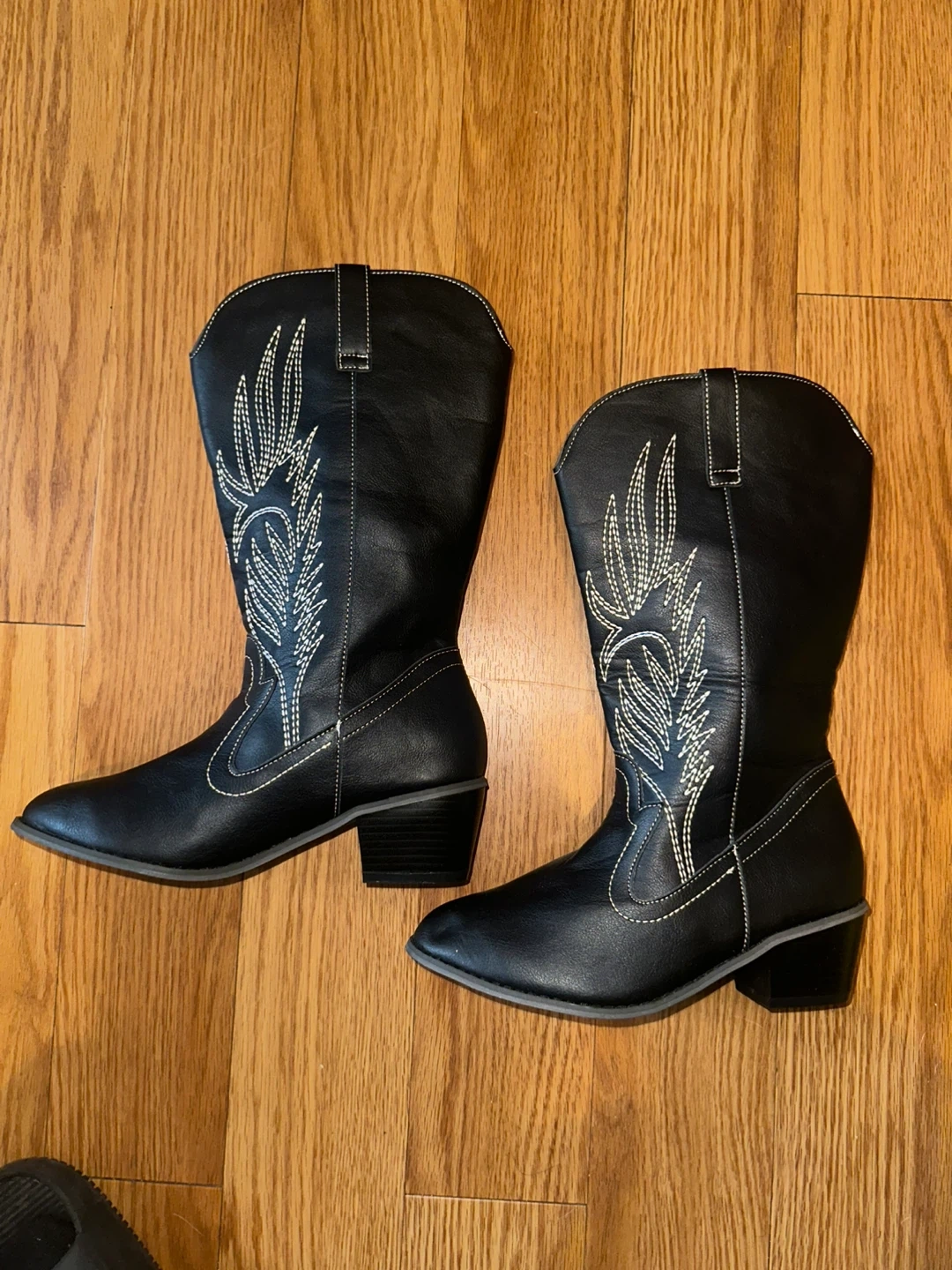 These black cowboy boots feature intricate white stitching details on the shaft and vamp. They have a classic Western silhouette with a comfortable block heel. Perfect for adding a touch of country style to any outfit!