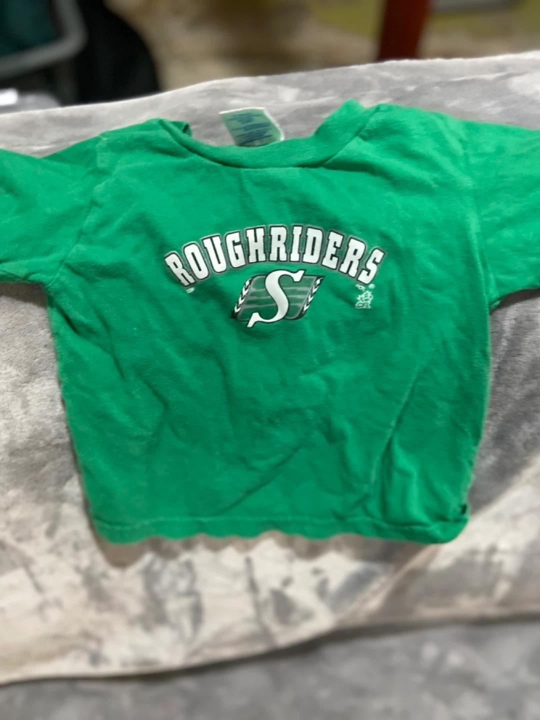 Bundle of two Saskatchewan Roughriders t-shirts for kids. Includes one green long-sleeve shirt and one black short-sleeve shirt. Green shirt is size Y-S. Cotton blend material.