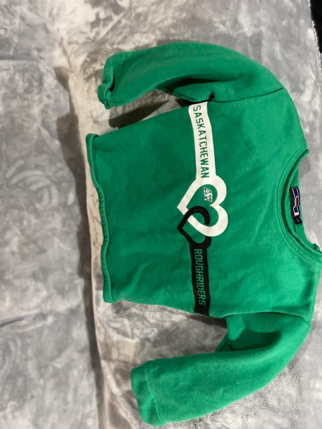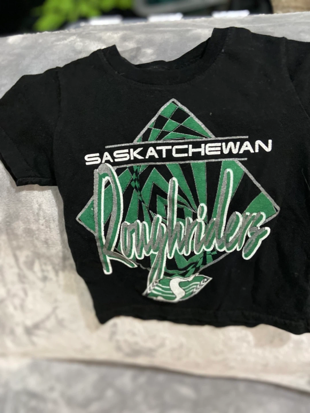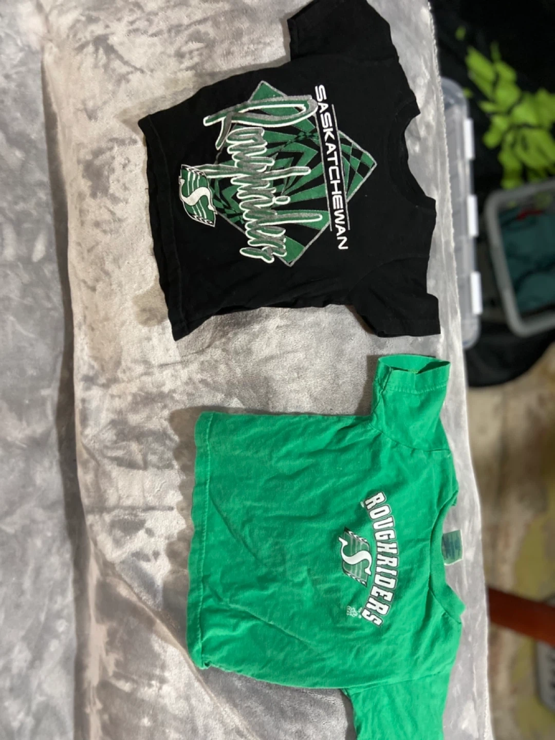 Bundle of two Saskatchewan Roughriders t-shirts for kids. Includes one green long-sleeve shirt and one black short-sleeve shirt. Green shirt is size Y-S. Cotton blend material.
