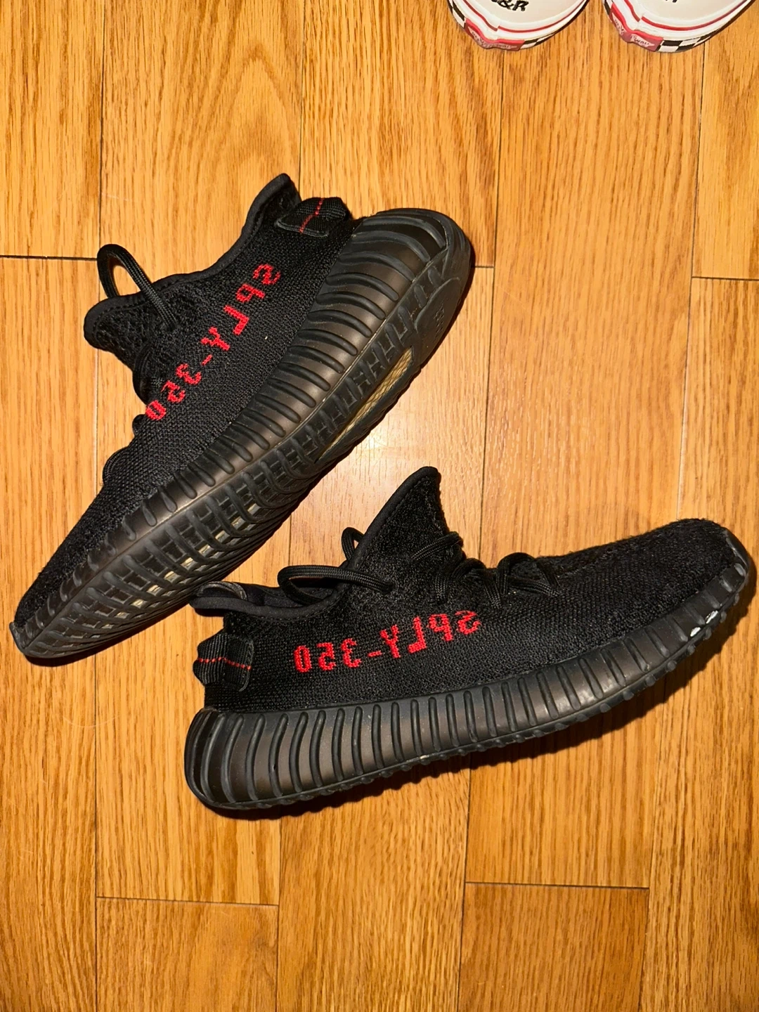 These Adidas Yeezy Boost 350 V2 sneakers are in the "Bred" colorway. They feature a black Primeknit upper with red "SPLY-350" text and a translucent black midsole. These are a popular streetwear staple!