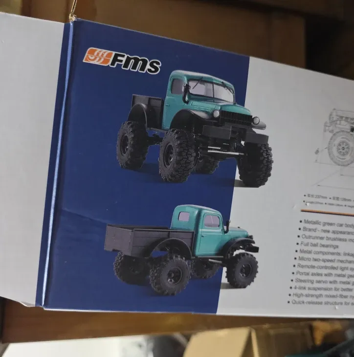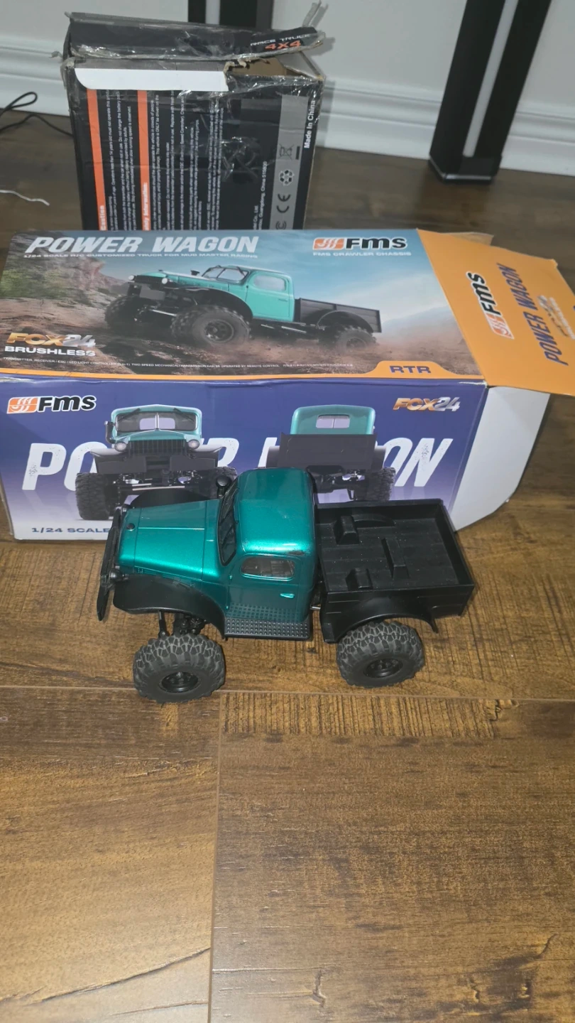It's an FMS Power Wagon remote-controlled truck in metallic green. This 1/24 scale model features a brushless motor and is ready to run (RTR). Metal components and high-strength mixed-fiber chassis are included.
