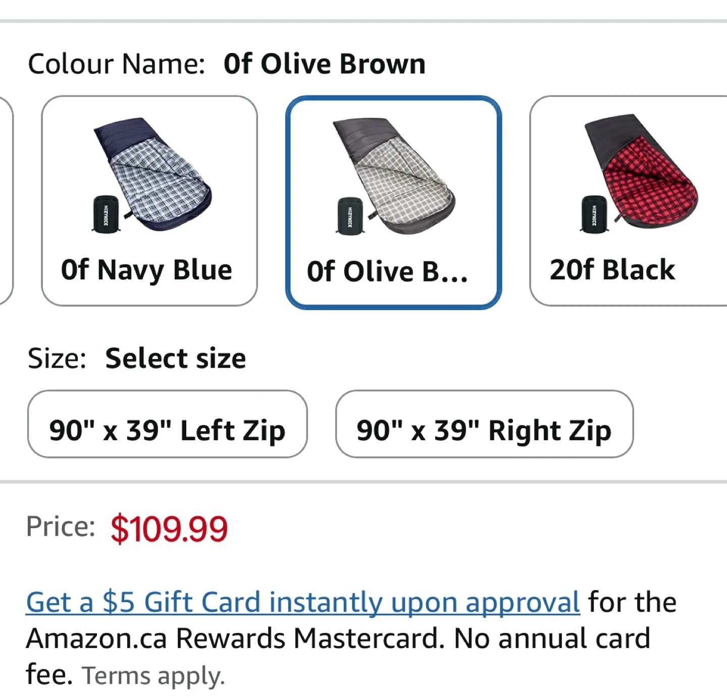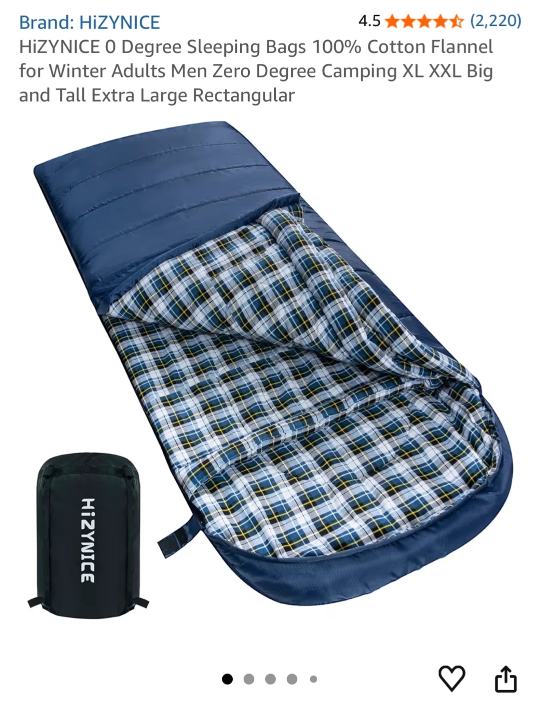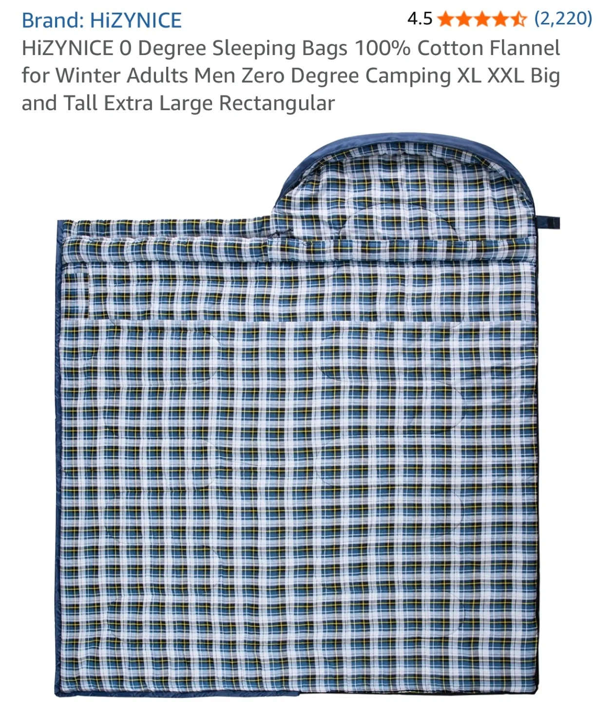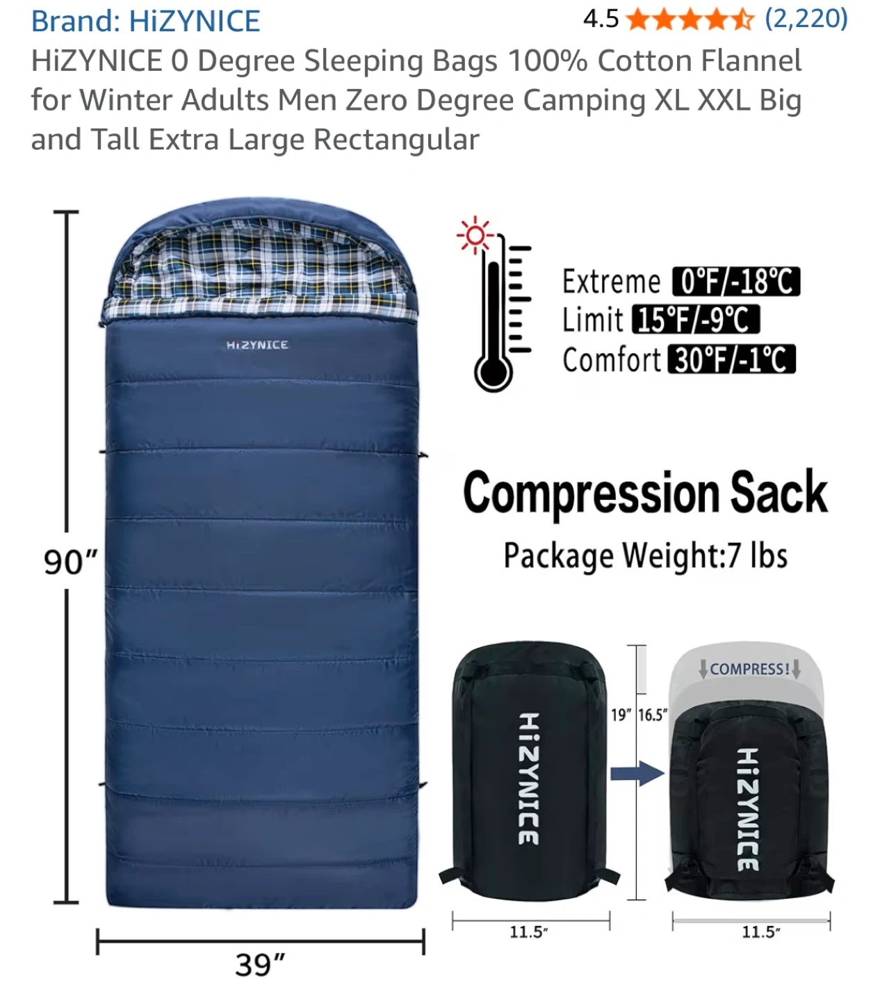 This HizyNice Olive sleeping bag is rated for 0 degrees Fahrenheit. It's made with 100% cotton flannel lining and measures 90" x 39". It includes a compression sack.