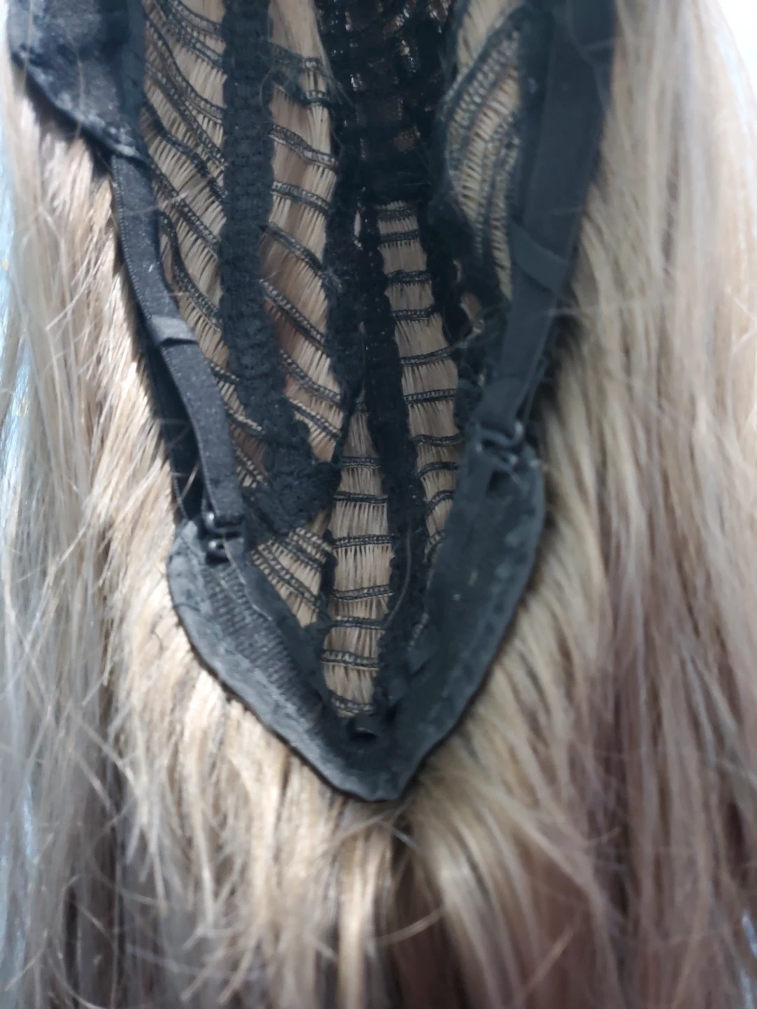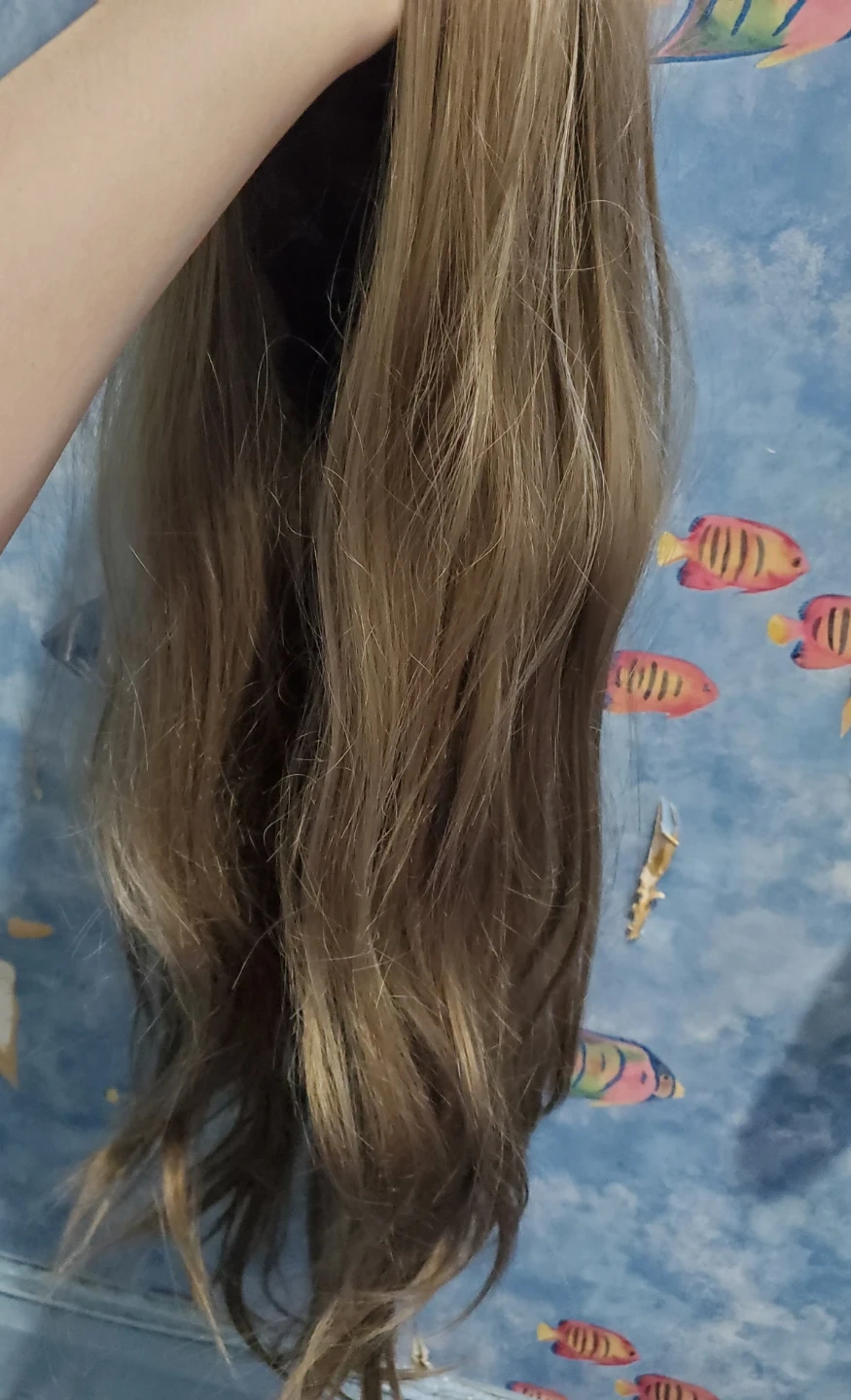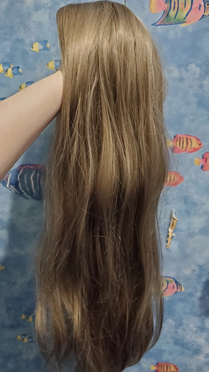 Long light ash brown synthetic fringeless wig. Has a mix of light brown and light grey strands. Wig is slightly wavy towards the ends. Length is approx 73 cm (while wavy), if straightened, would estimate close to 80 cm. Have not tried to heat style so can't comment on if the wig is heat style friendly. Comes with hair net and wig cap. The wig base has clasps to secure the wig to the wig cap. Good condition, but some of the hairs near the ends feel slightly coarser/less smooth than the hair near the base.