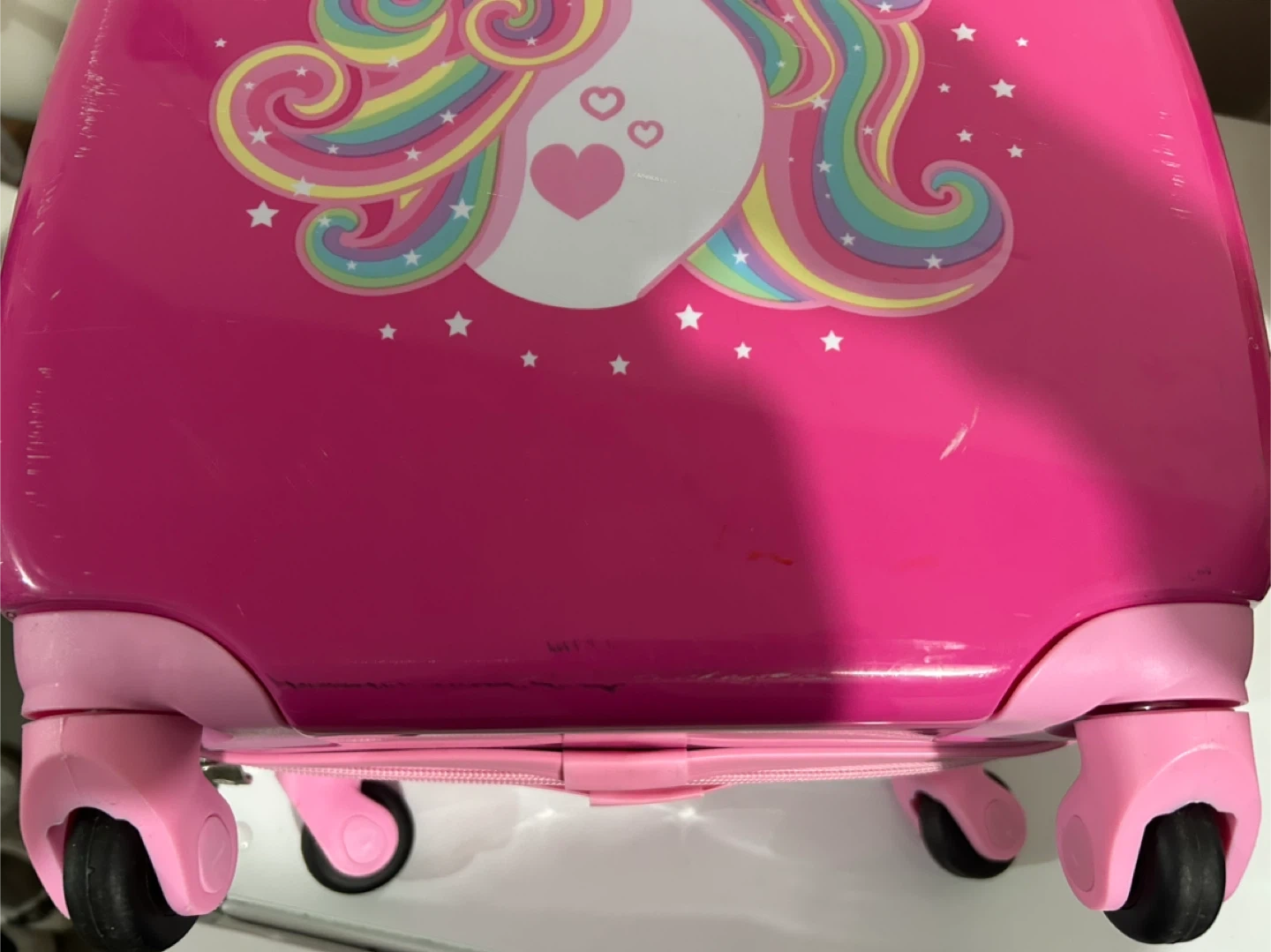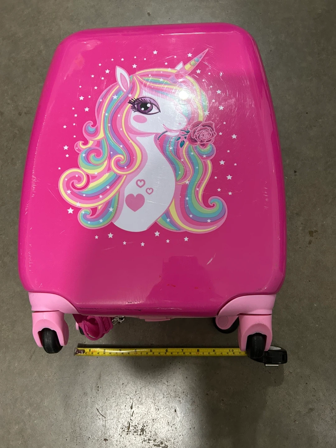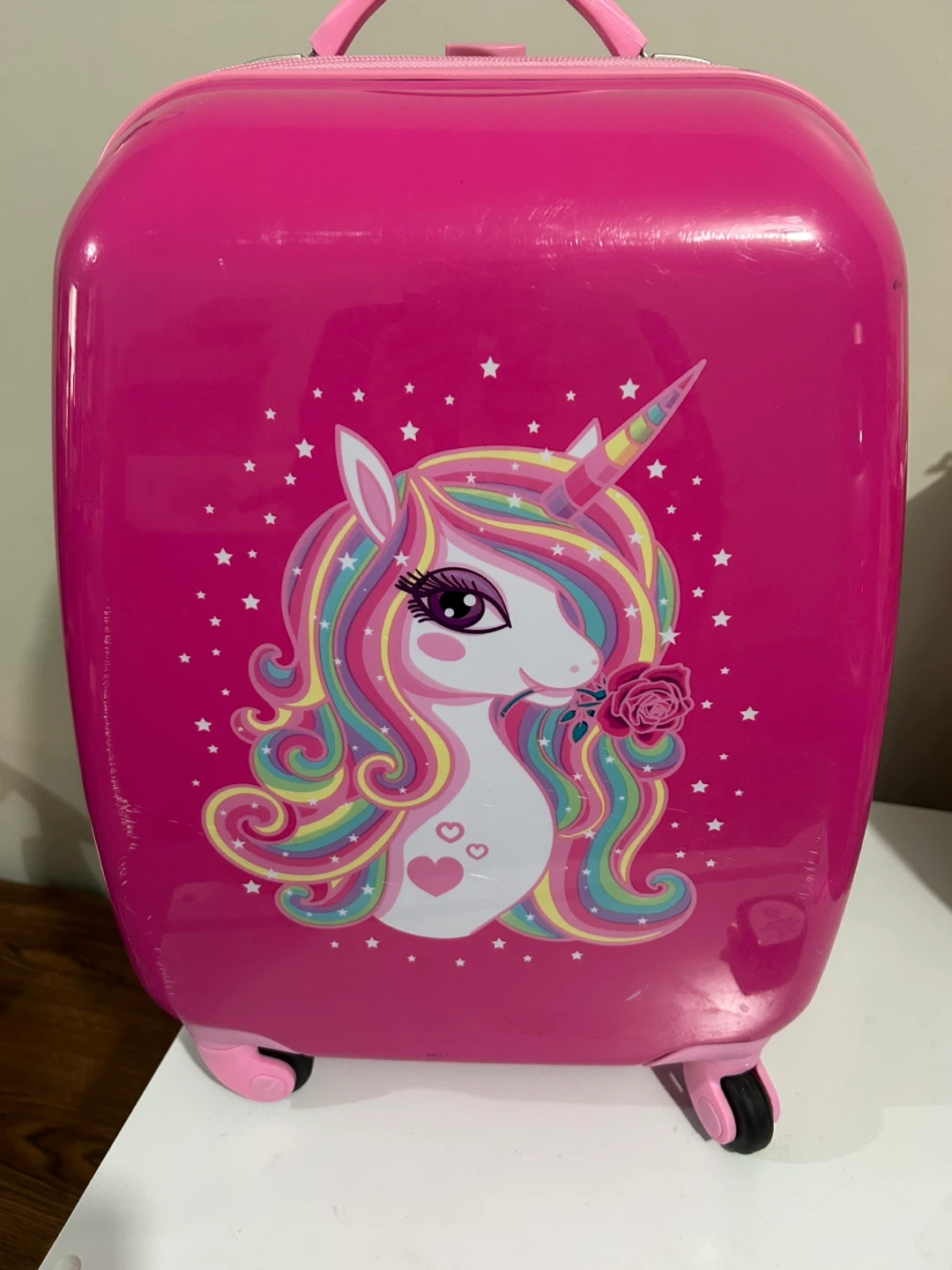 This vibrant pink rolling suitcase features a colourful unicorn design, perfect for young travellers! It's made of durable hard shell material and has interior straps to keep belongings secure. An ideal carry-on for sleepovers or short trips.
