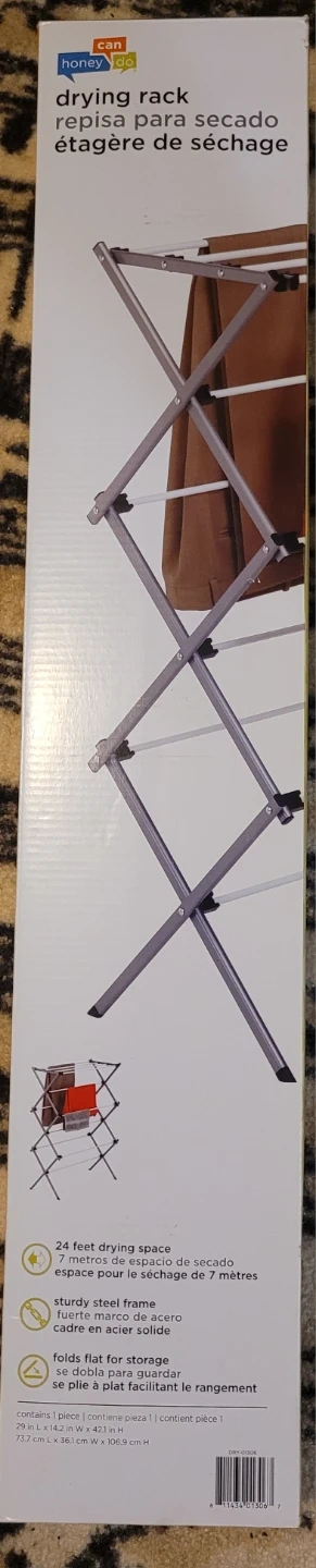 This is a Honey-Can-Do drying rack with 24 feet of drying space. It features a sturdy steel frame and folds flat for convenient storage. Its dimensions are 73.7 cm L x 36.1 cm W x 106.9 cm H.