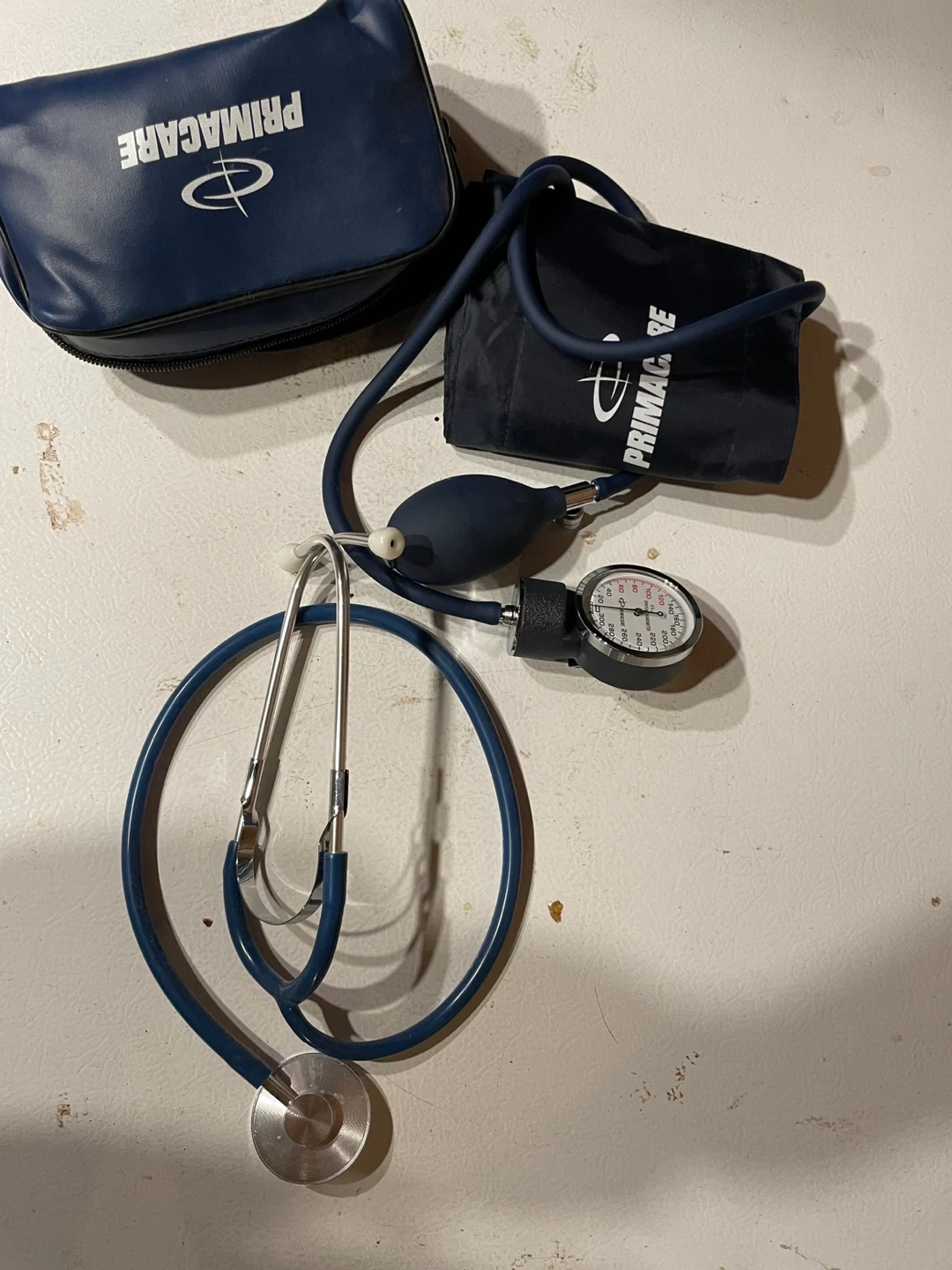 Primacare manual blood pressure monitor. It comes with a carrying pouch. The set includes a blood pressure cuff, bulb, gauge, and stethoscope.