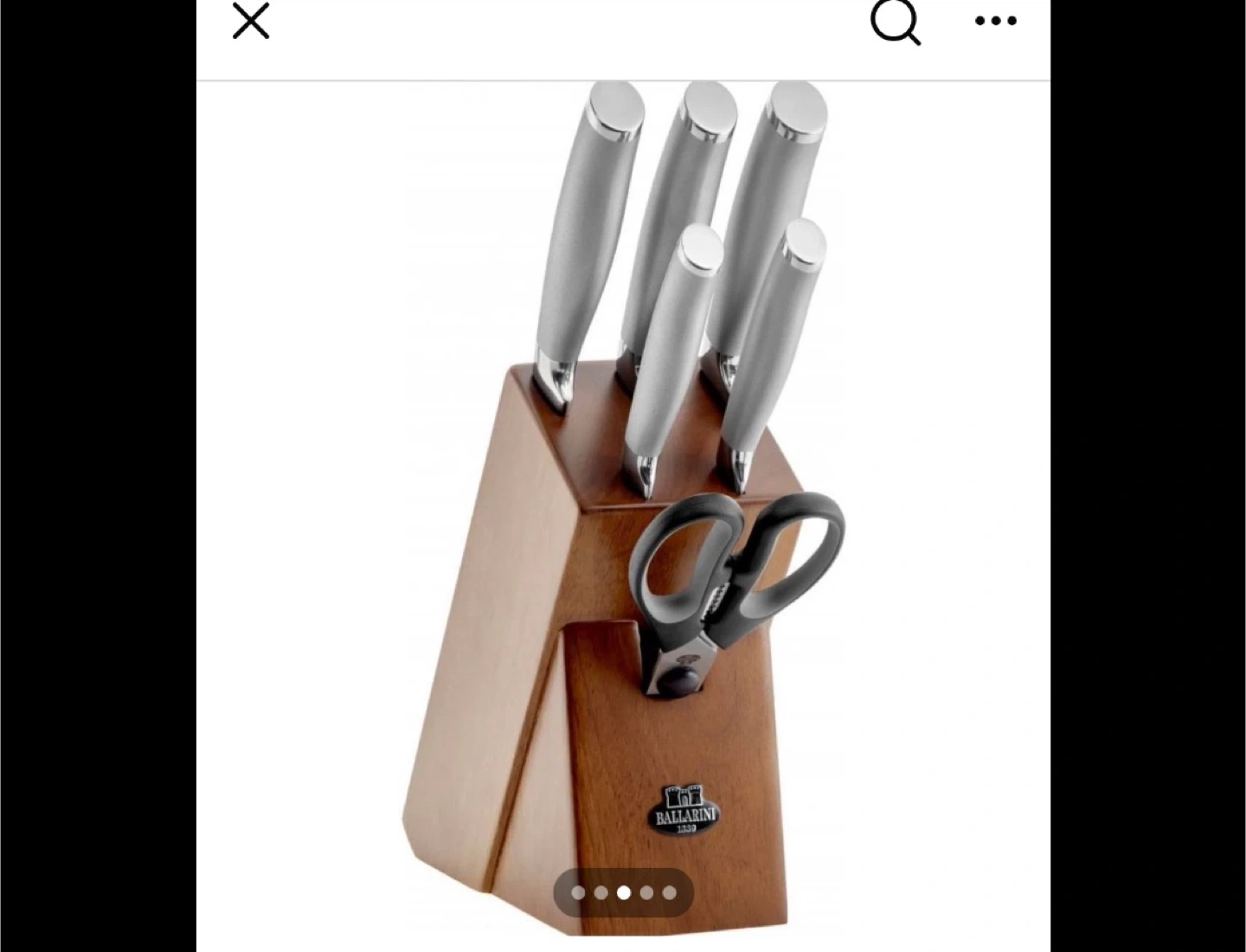 This BALLARINI knife block set includes five knives and a pair of kitchen shears. The block is made of wood and comes with stainless steel knives. It's a handy set for any kitchen!