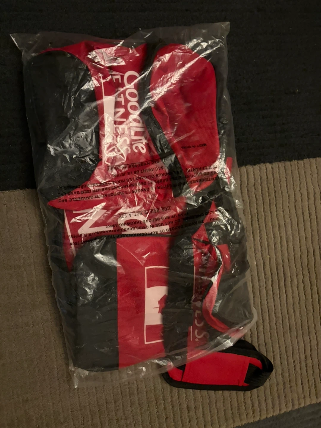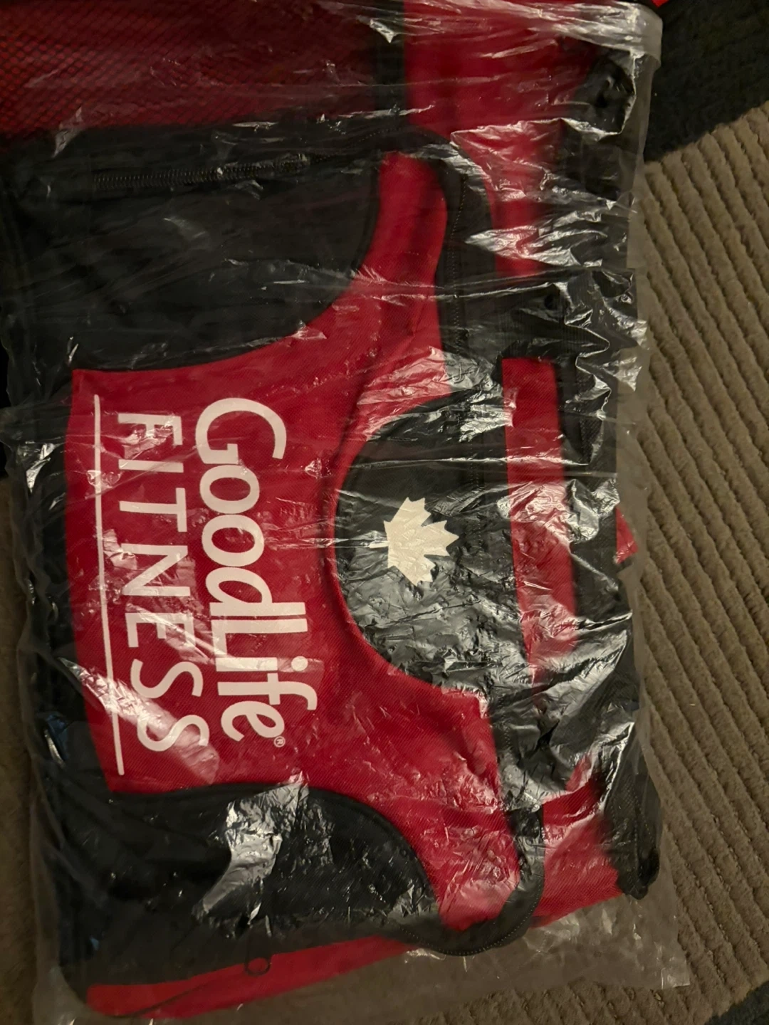 This GoodLife Fitness duffle bag is red and black. It has a Canadian flag design on the side. It's still in its original packaging.