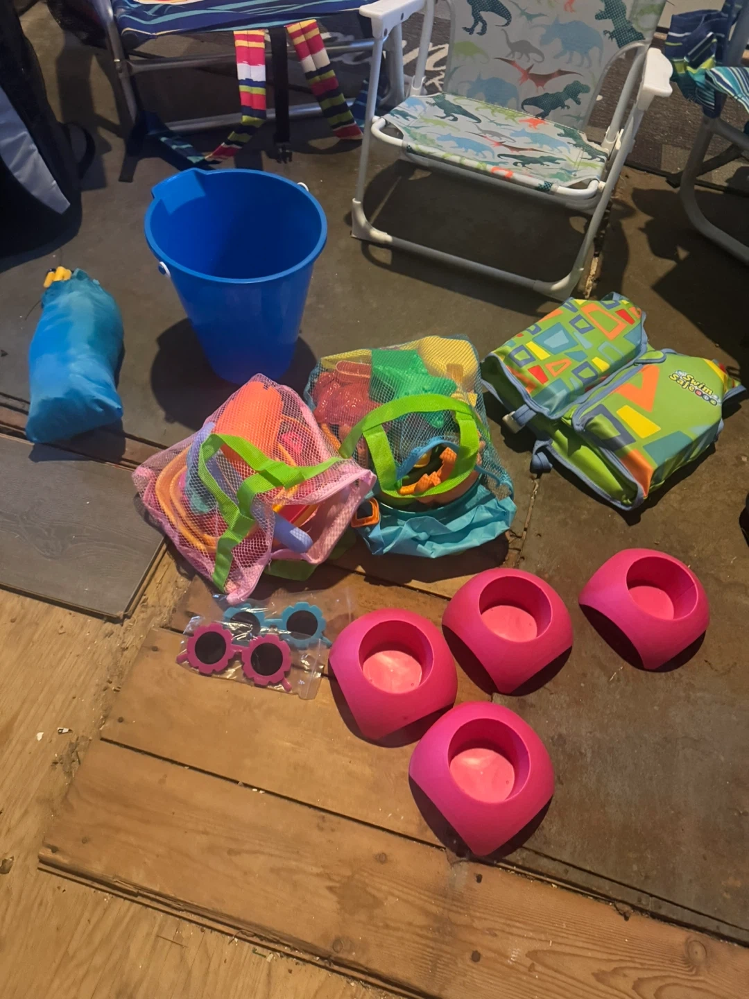 Assortment of beach toys in mesh bags, bucket, sunglasses