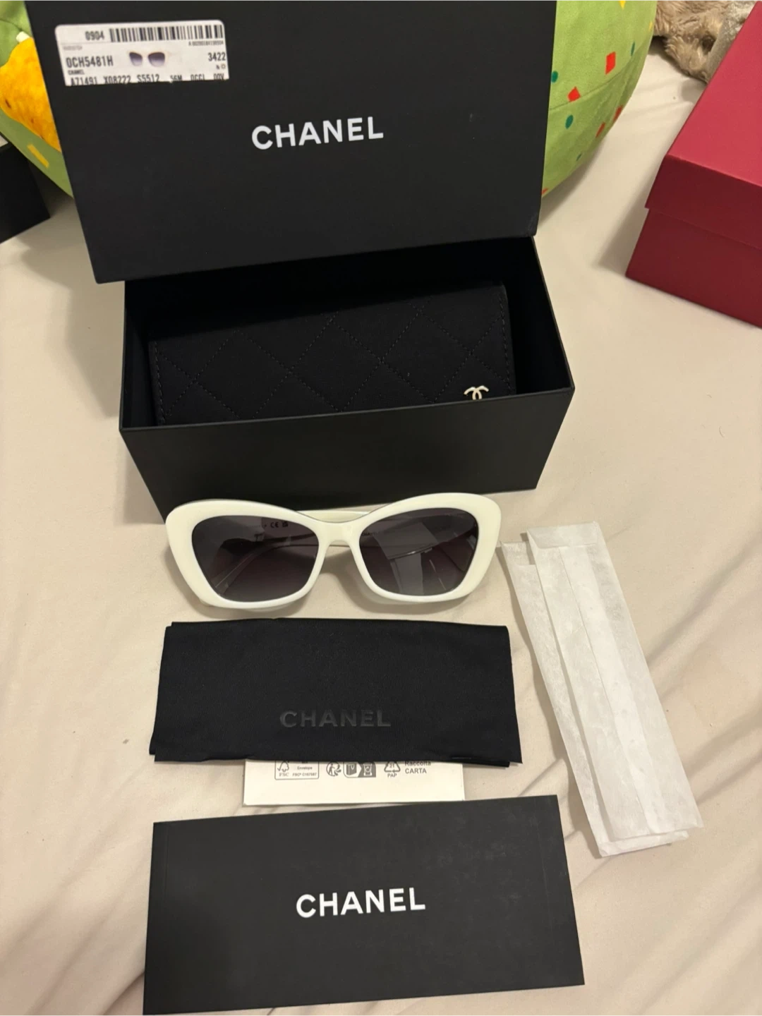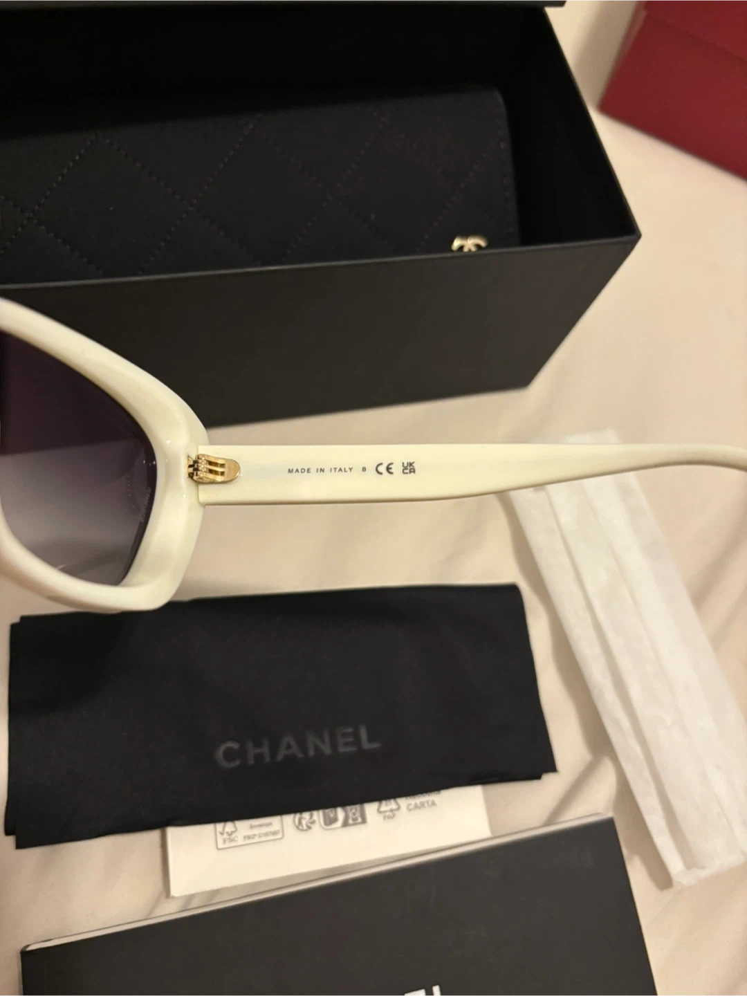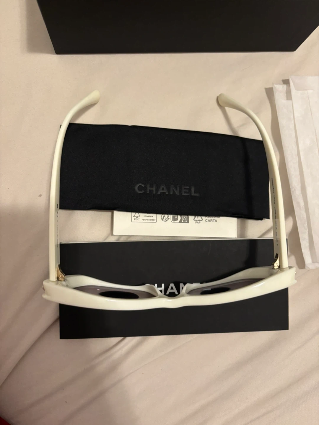 Selling a beautiful pair of Chanel cat eye sunglasses with a white acetate frame and glass pearl detailing! These sunglasses have gray, gradient lenses and come with the original box and packaging