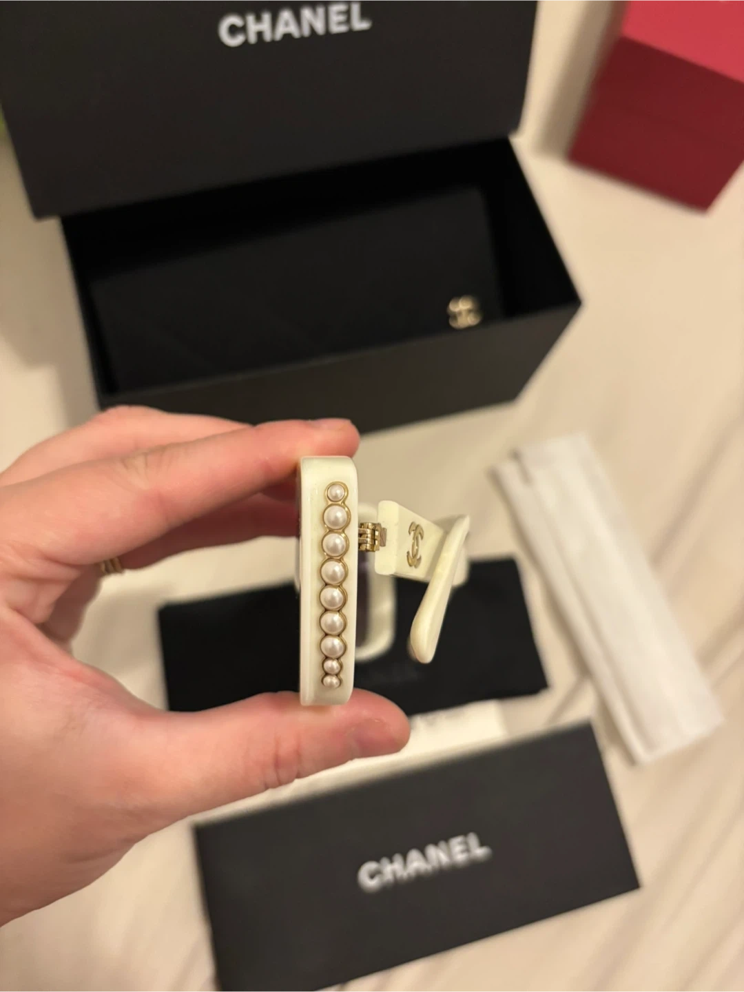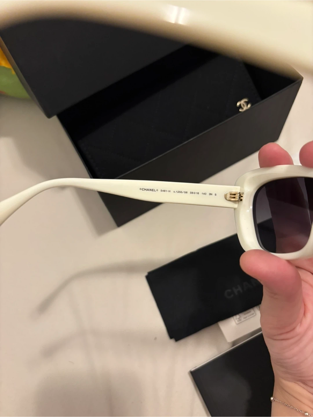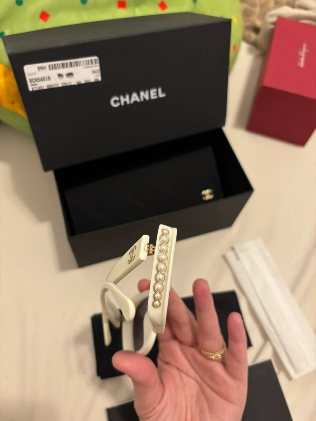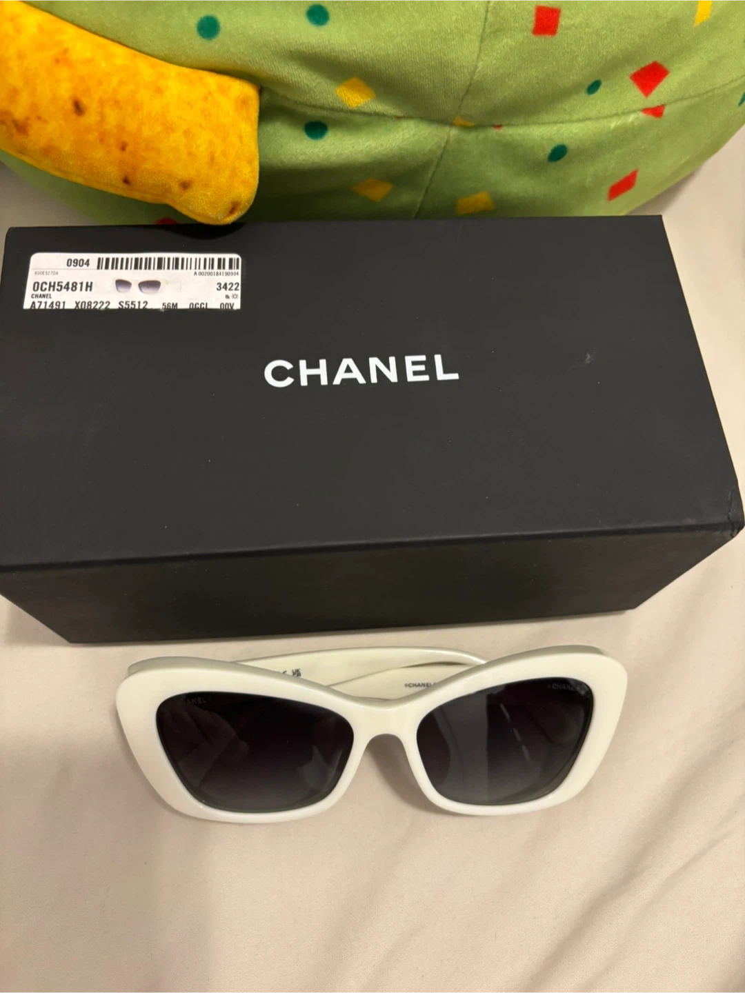 Selling a beautiful pair of Chanel cat eye sunglasses with a white acetate frame and glass pearl detailing! These sunglasses have gray, gradient lenses and come with the original box and packaging