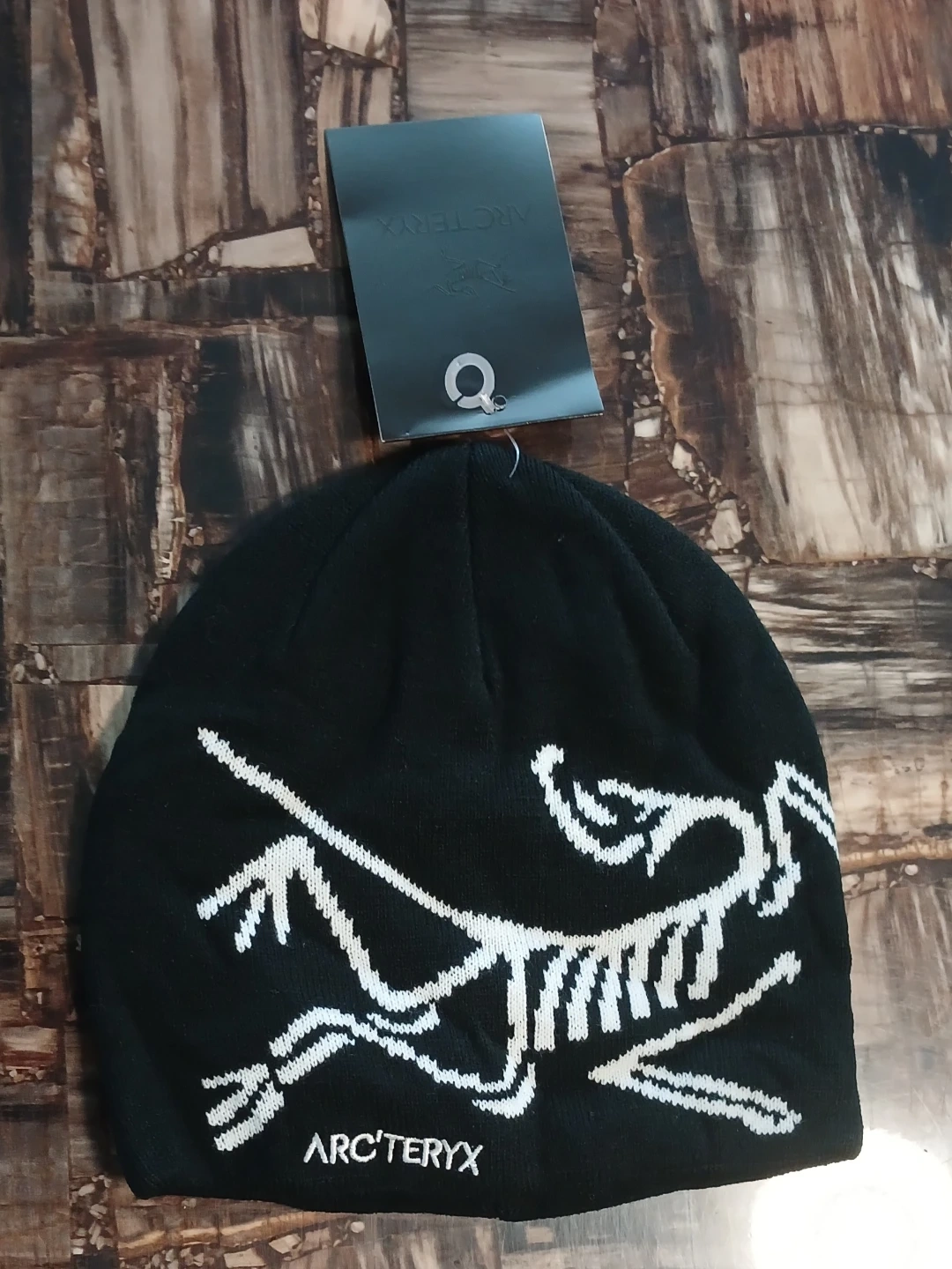 Arc'teryx black knit beanie. It features a white graphic design and the Arc'teryx logo. This beanie is made from a soft, warm material.