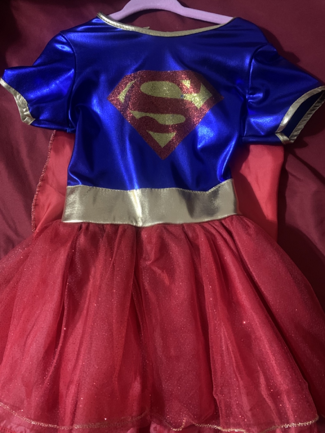 Selling a Supergirl costume! It's a blue and red dress with the Supergirl logo on the chest. The skirt is a sparkly red colour. Perfect for dress-up or Halloween!