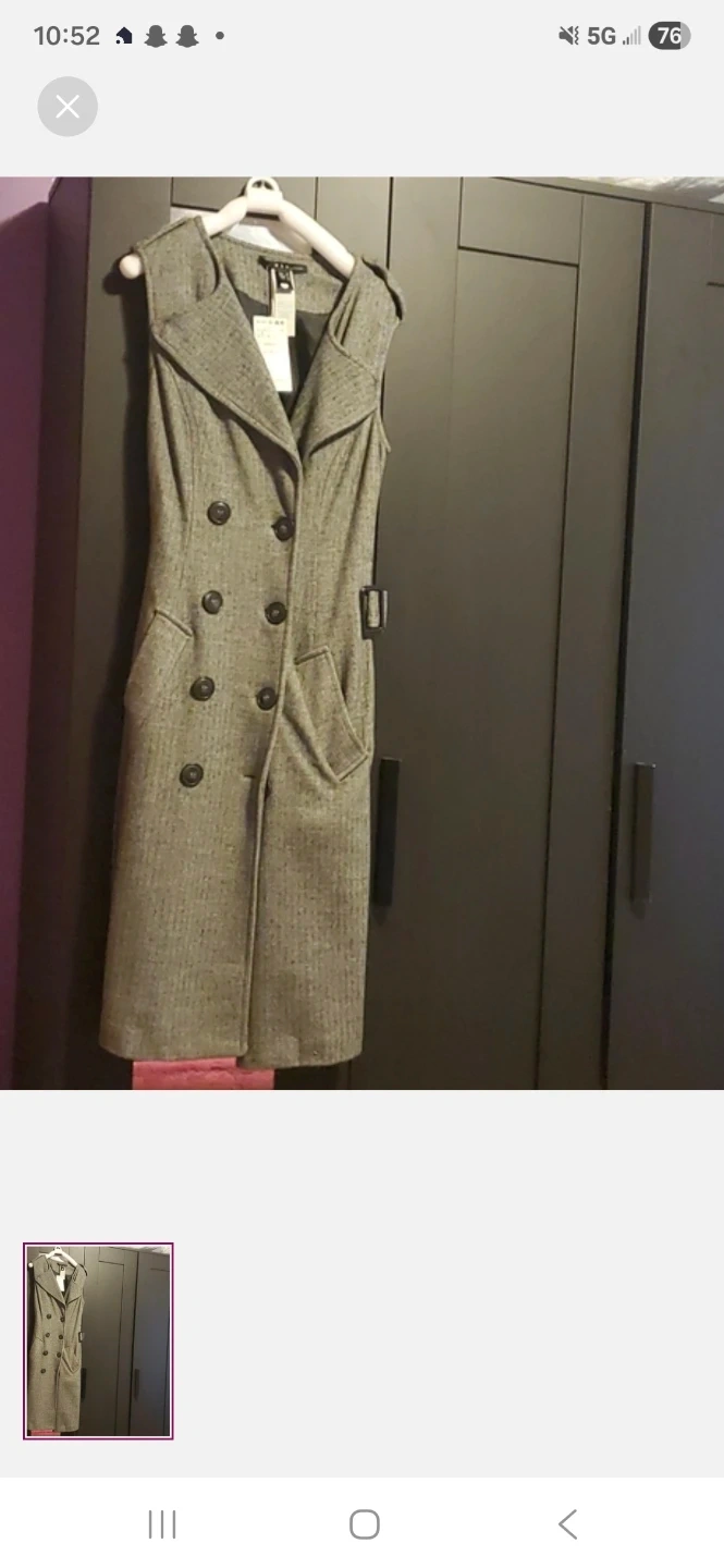 Sleeveless trench coat vest with a double-breasted button closure. Features a belt at the waist and two front pockets. Made from a textured fabric blend.