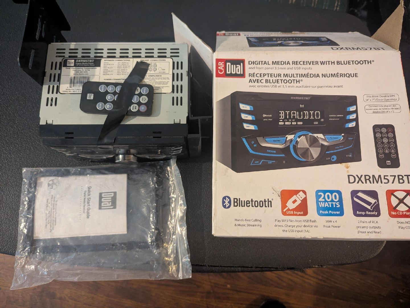 Selling a Dual DXRM57BT digital media receiver with Bluetooth! It fits most double DIN (4" x 7") dash openings. It comes with a remote, quick start guide, and the original box. It has USB input and is amp-ready!