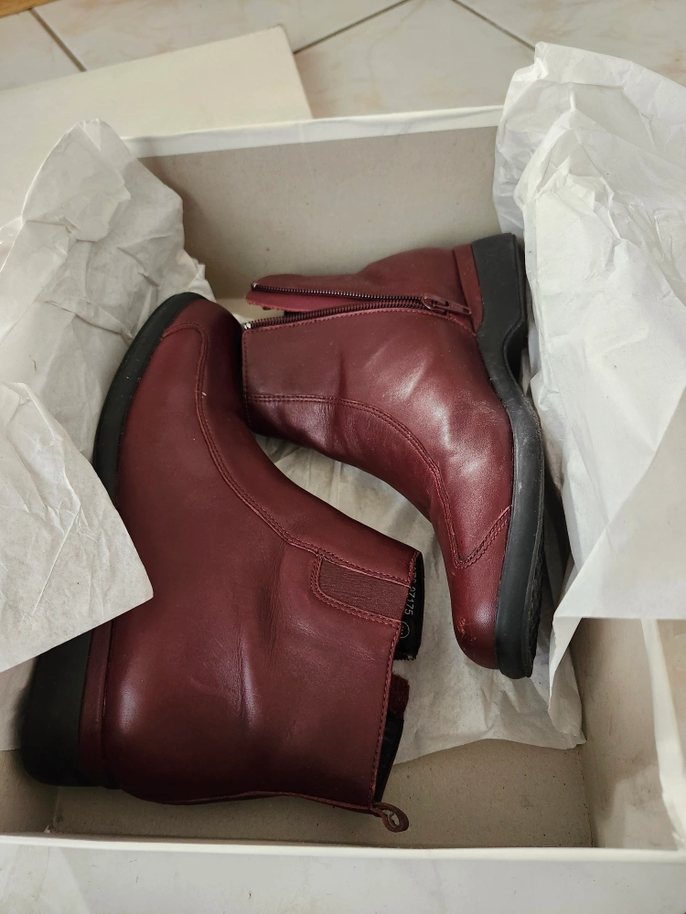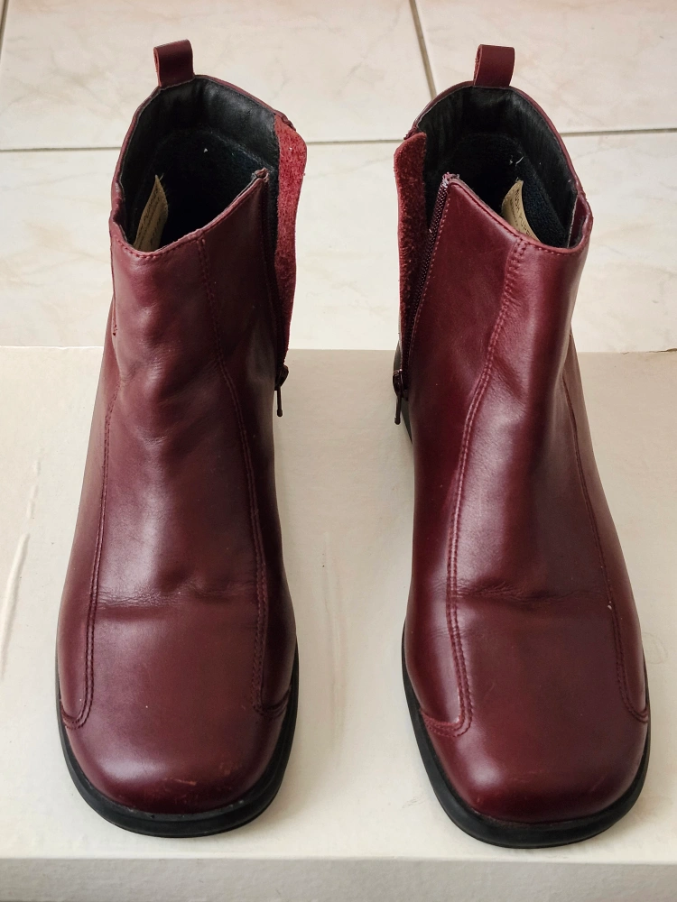 Women's leather boots with a side zipper. The boots have a low heel and a rounded toe.