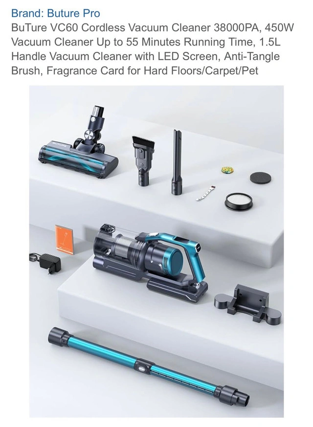 New Buture VC60 cordless vacuum cleaner with powerful 38000PA suction and a 450W motor. This lightweight vacuum offers up to 55 minutes of runtime and features a 1.5L dustbin, an LED screen, and an anti-tangle brush.