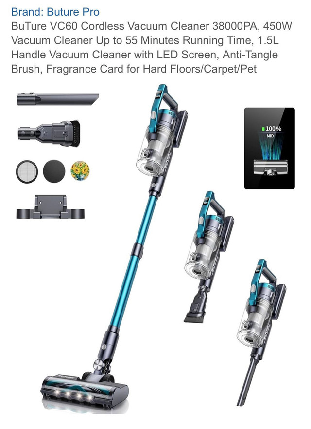 New Buture VC60 cordless vacuum cleaner with powerful 38000PA suction and a 450W motor. This lightweight vacuum offers up to 55 minutes of runtime and features a 1.5L dustbin, an LED screen, and an anti-tangle brush.