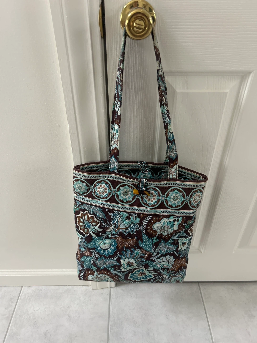 This quilted tote bag features a colorful floral and paisley pattern. It has a fabric lining and interior pockets. It's a stylish and practical bag for everyday use!