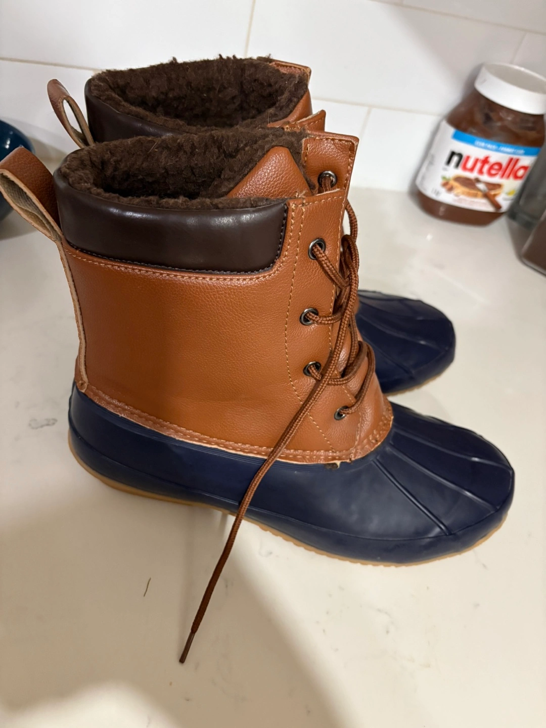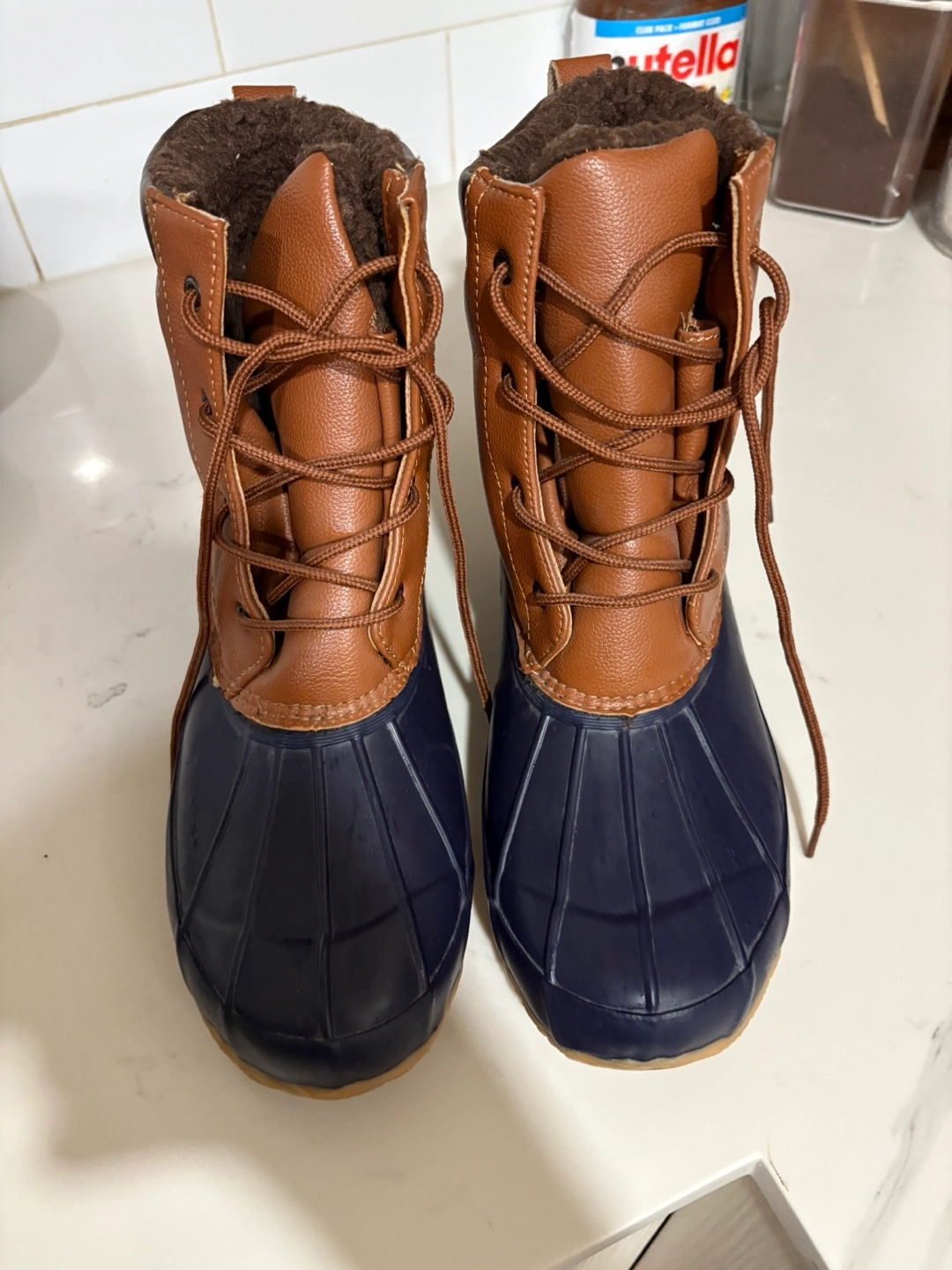 Selling a pair of duck boots in a classic brown and navy colour combo! They're a size 10, perfect for keeping your feet warm and dry and good for snow too. These boots are super comfy and ready for a new home! They have never been worn.