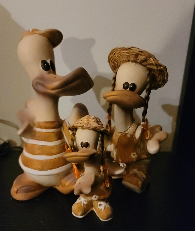 Cute set of duck figurines for your home! Includes a mama duck, papa duck, and baby duck. These charming figurines are in great condition and would look lovely on a shelf or mantelpiece