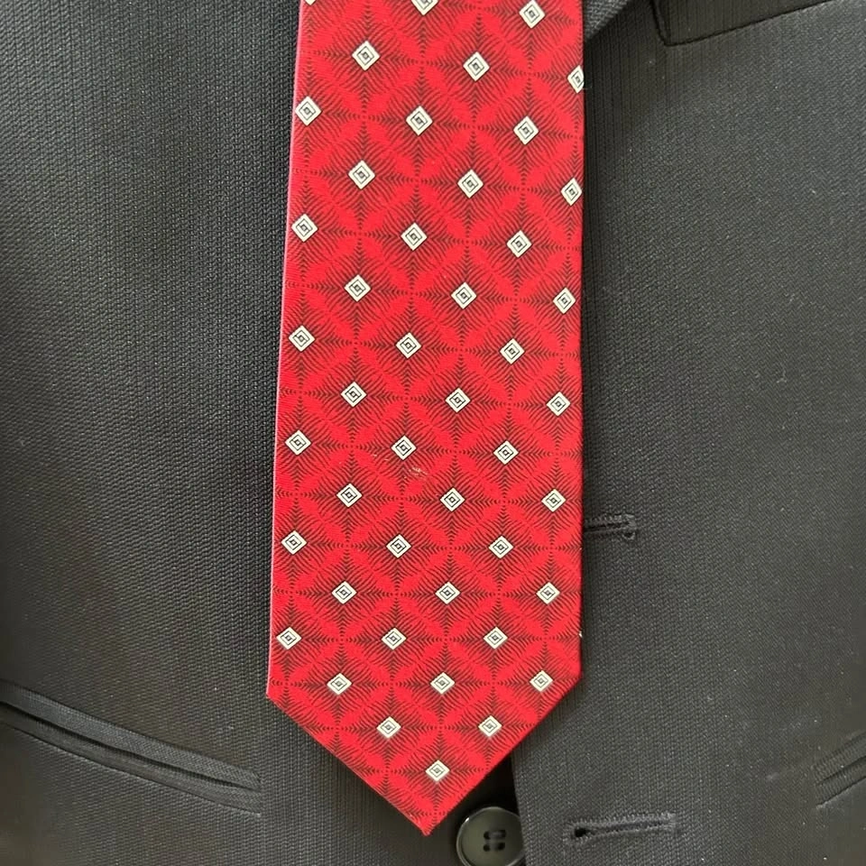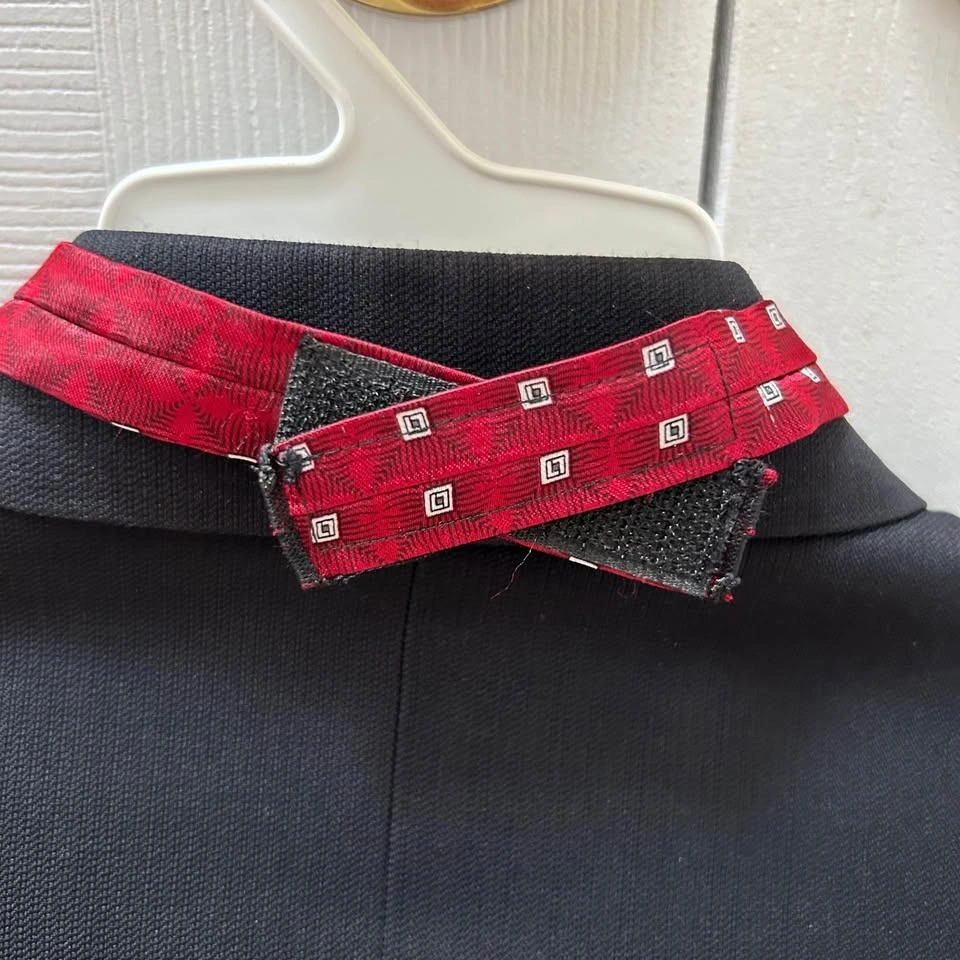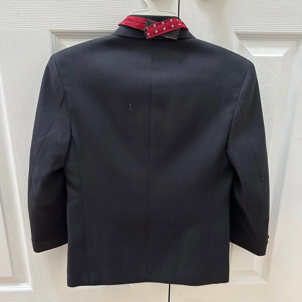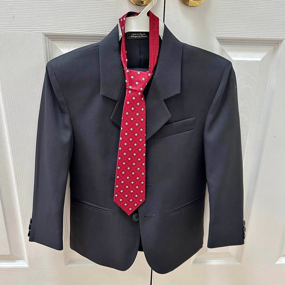 First Communion suit for boys, used and in excellent condition. Comes with blazer, pants and strap on dark red tie. Made in Canada, 100% polyester. Size 7.