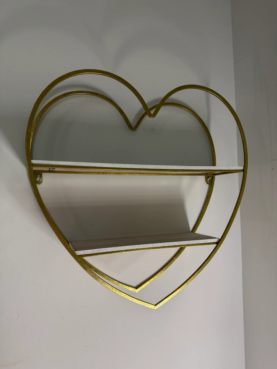 Add a touch of love to your space with this adorable heart-shaped wall shelf! It features a gold-tone metal frame and two shelves for displaying your favourite trinkets or small plants. Perfect for a bedroom, living room, or any space that needs a little extra charm
