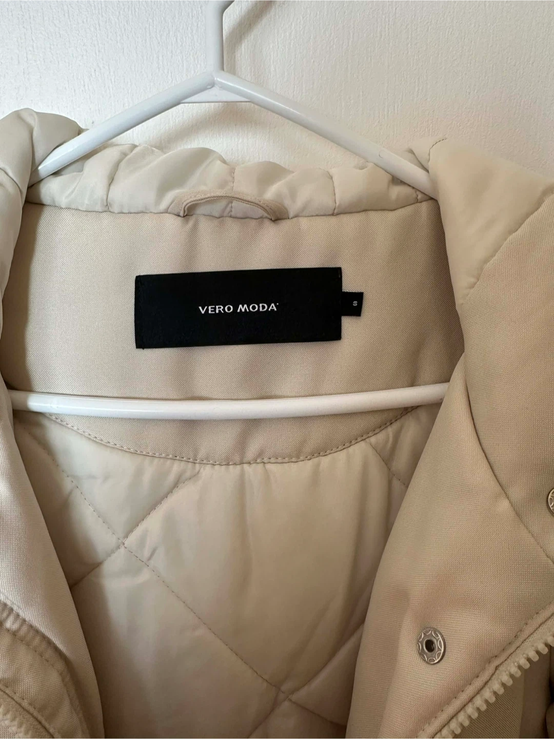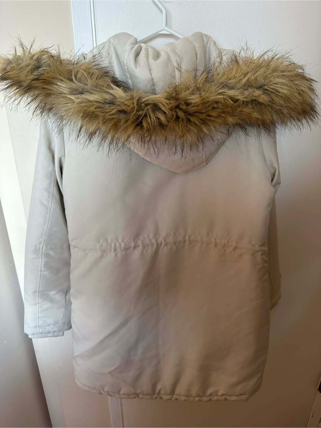 This VERO MODA winter parka is a size small and comes in a nice beige colour. It features a warm, quilted lining and a faux fur-trimmed hood, perfect for staying cosy during colder months. The jacket has multiple pockets and a zippered closure with snap buttons. Pick up cash only