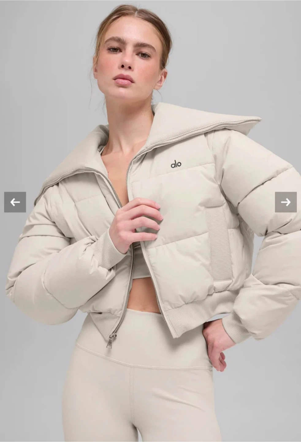 Cream coloured cropped puffer jacket by Alo. It features a zip-up front and ribbed cuffs. This jacket is perfect for layering during cooler weather. In perfect condition