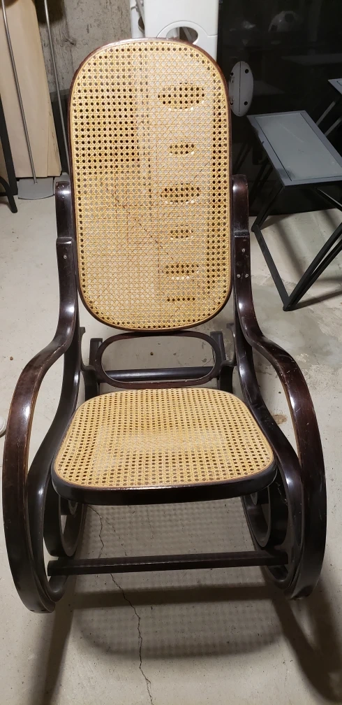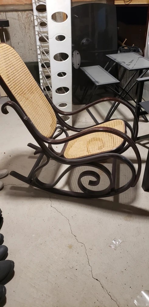 Selling a beautiful antique bentwood rocking chair. It has a unique and elegant design with a woven seat and back. It's a classic piece that would add charm to any room. The chair shows some signs of wear consistent with its age, but it's still sturdy and comfortable. A lovely piece for relaxing!