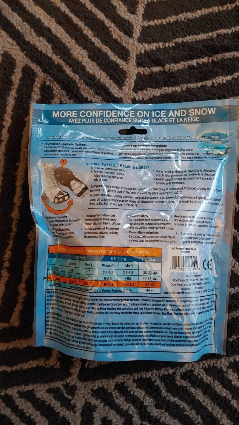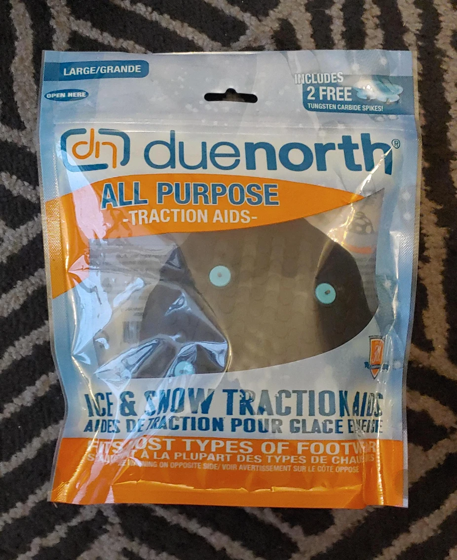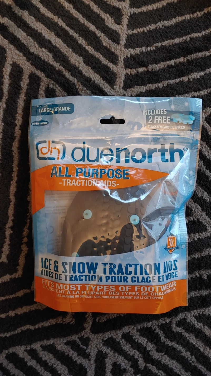 10Get ready for icy conditions with these Due North All Purpose Traction Aids! They fit most types of footwear and are perfect for ice and snow. The package includes 2 free tungsten carbide spikes for extra grip. Size large.