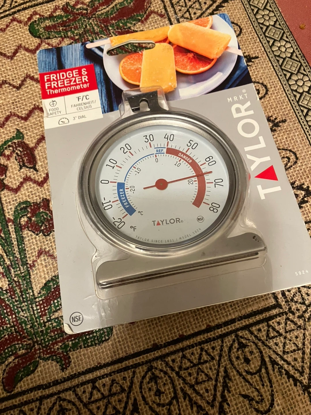 This is a Taylor fridge and freezer thermometer. It measures temperature in both Fahrenheit and Celsius. The dial is 3 inches wide and NSF certified.