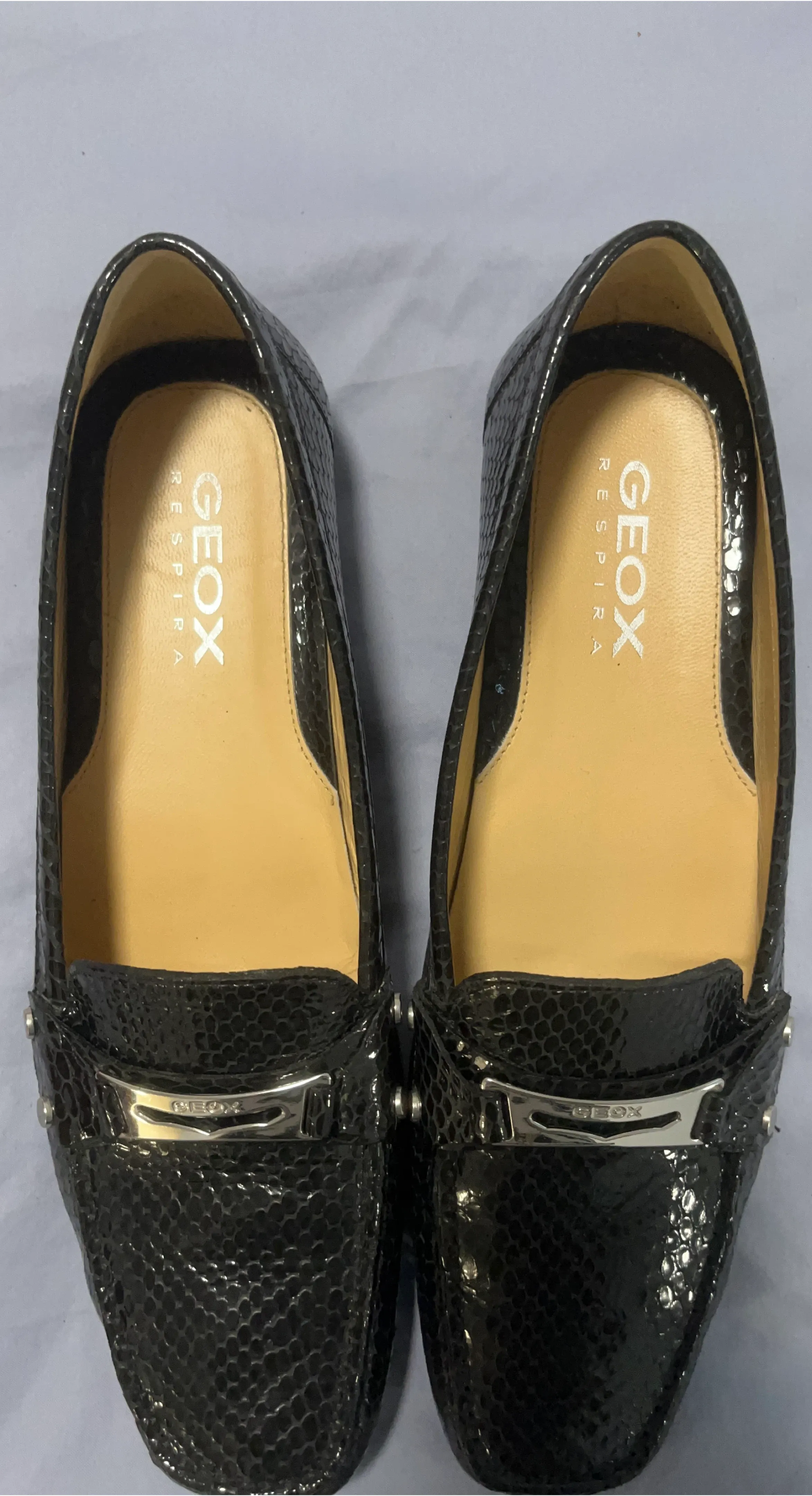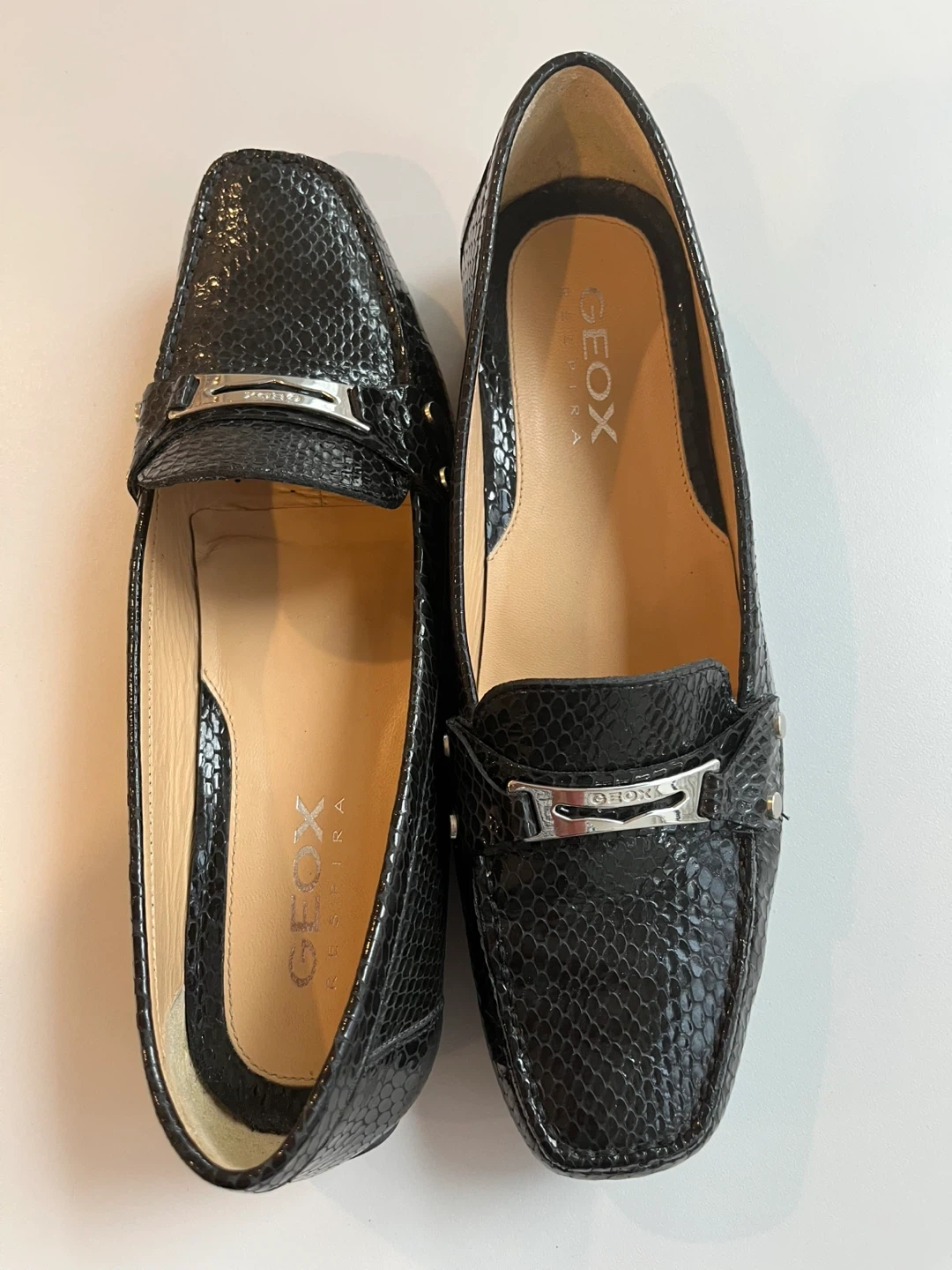 Comfortable GEOX loafers with a stylish black snakeskin . These shoes are designed for breathability and a great fit. Features a decorative silver buckle at the front.