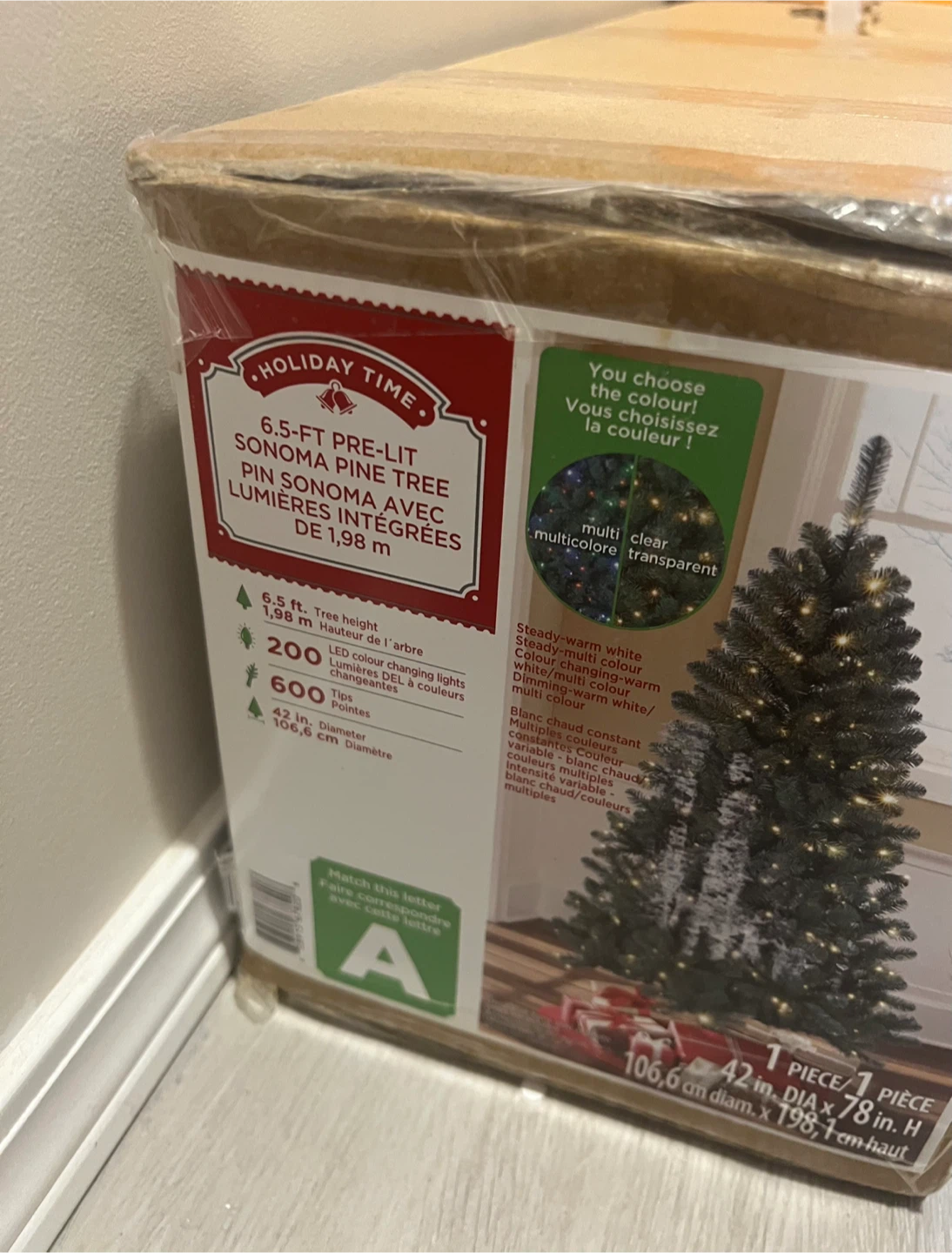 Selling a Holiday Time 6.5-ft Pre-Lit Sonoma Pine Tree! It comes with LED colour changing lights and 600 tips. The tree height is 6.5 ft (1.98 m) and the diameter is 42 inches (106.6 cm). You can choose the colour: multi clear or multicolore transparent!