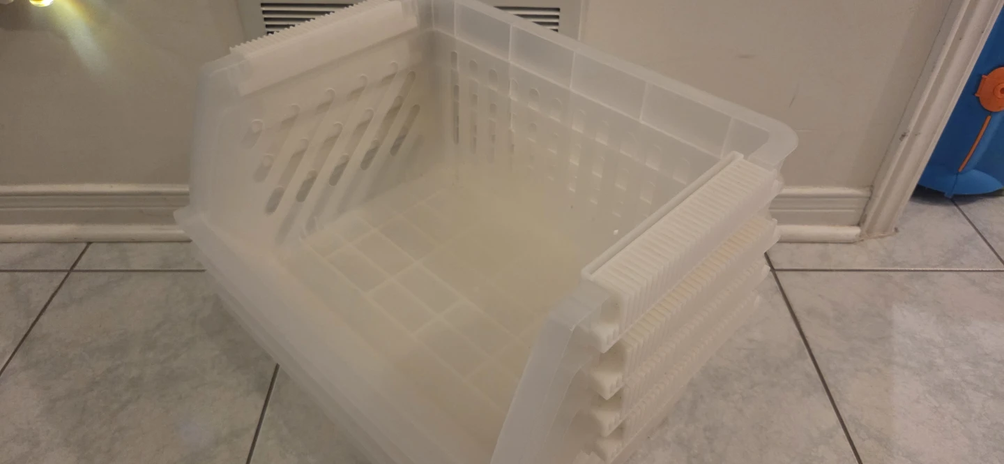 Set of four stackable plastic storage bins. These bins are clear and opaque white. They're designed for easy organization and can be stacked to save space. Each bin has ventilation slots and handles for carrying.