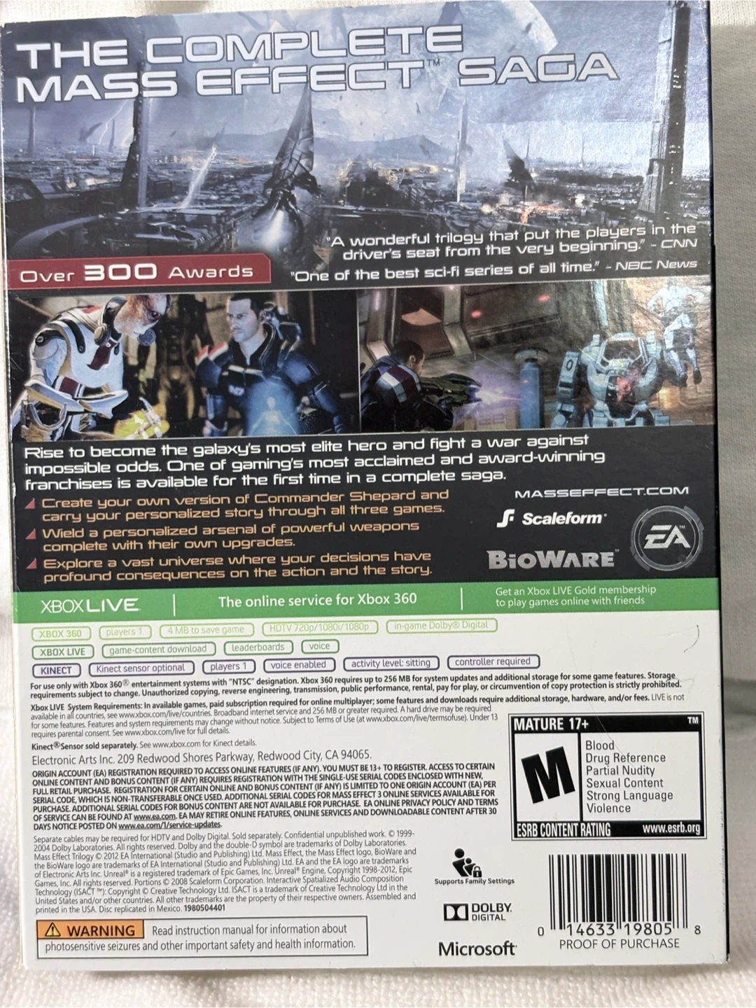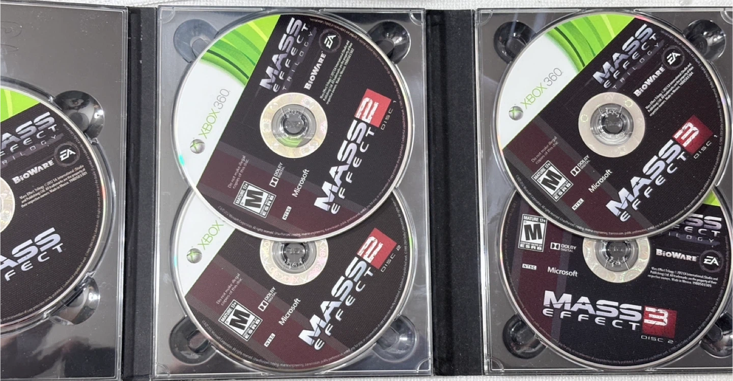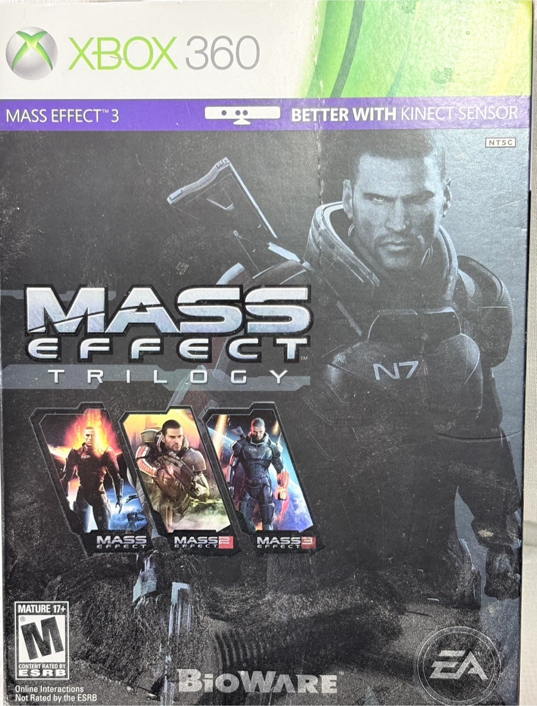 This is the complete Mass Effect Trilogy for Xbox 360. It includes Mass Effect, Mass Effect 2, and Mass Effect 3. It's rated Mature 17+ by the ESRB.