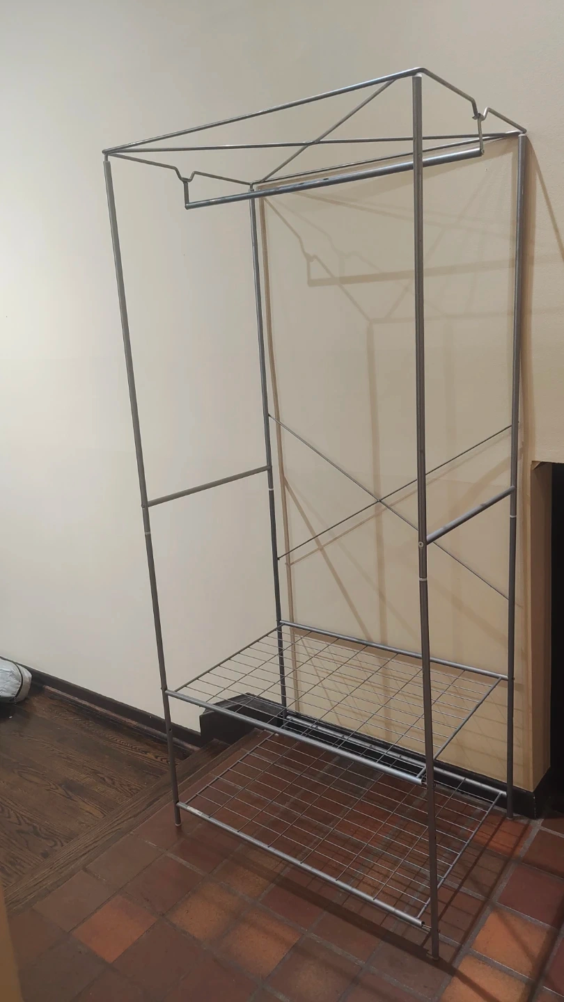 Selling a simple metal clothes rack with wire shelves. It's in good condition and perfect for adding extra storage to a closet or bedroom