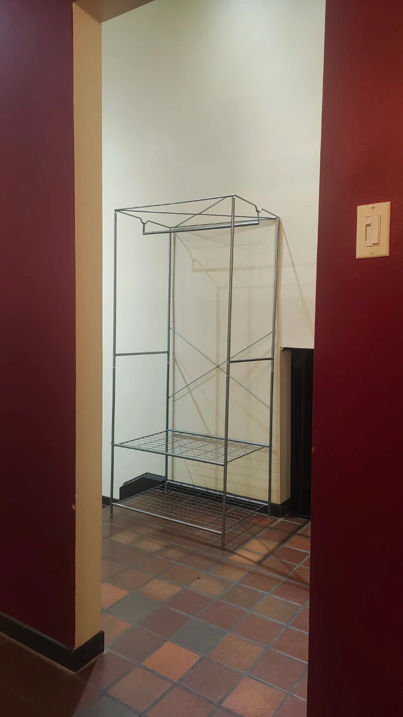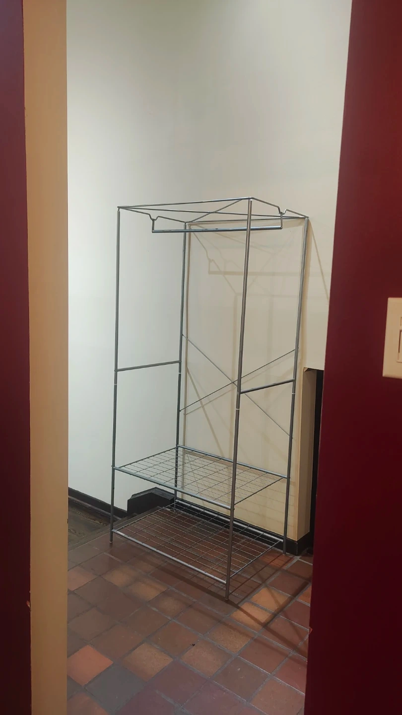 Selling a simple metal clothes rack with wire shelves. It's in good condition and perfect for adding extra storage to a closet or bedroom