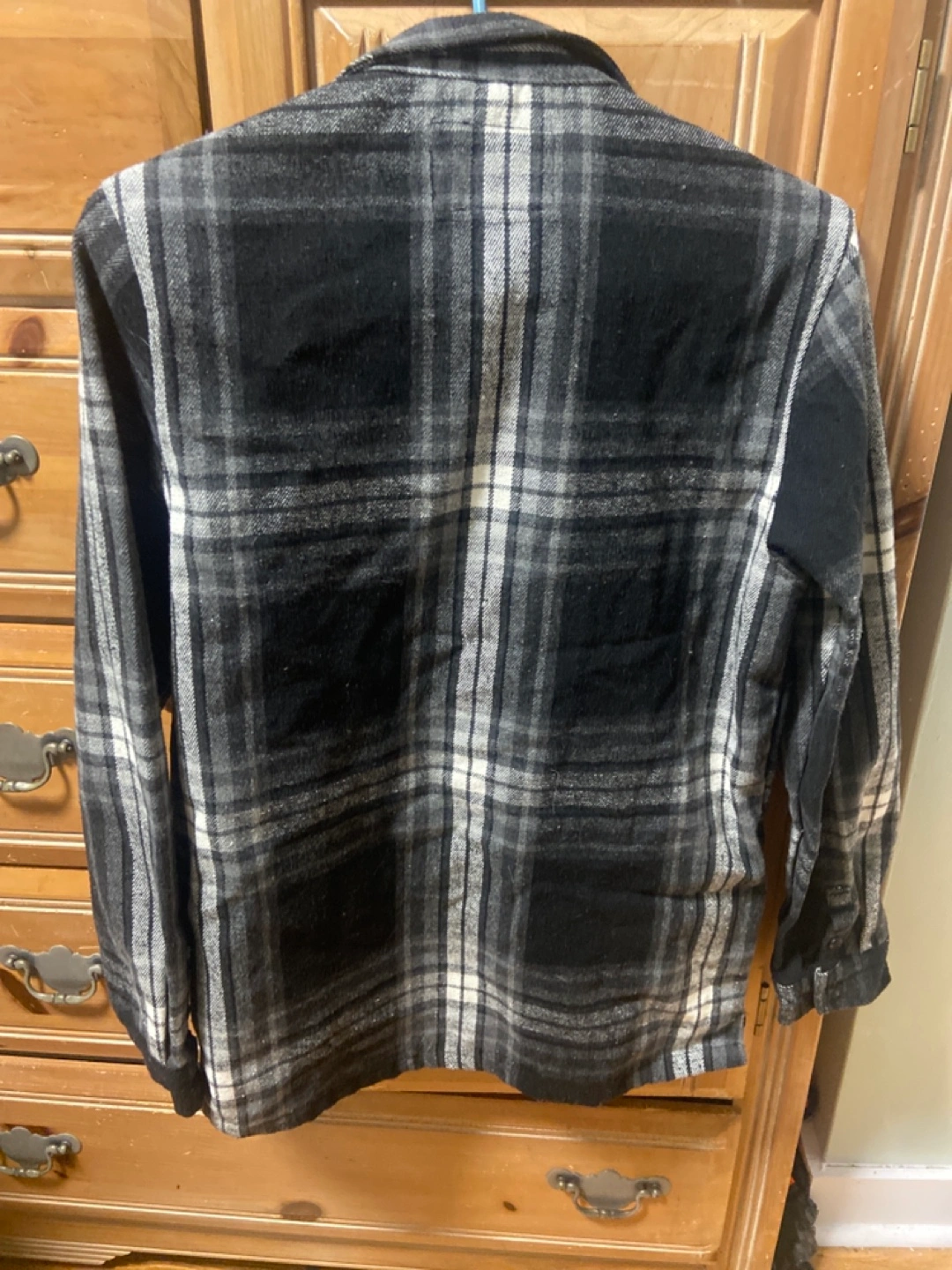 Black and grey plaid flannel shirt. Long sleeves, button closure. Two front pockets. Youth/Jeunes size large/grande (14).