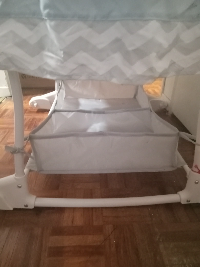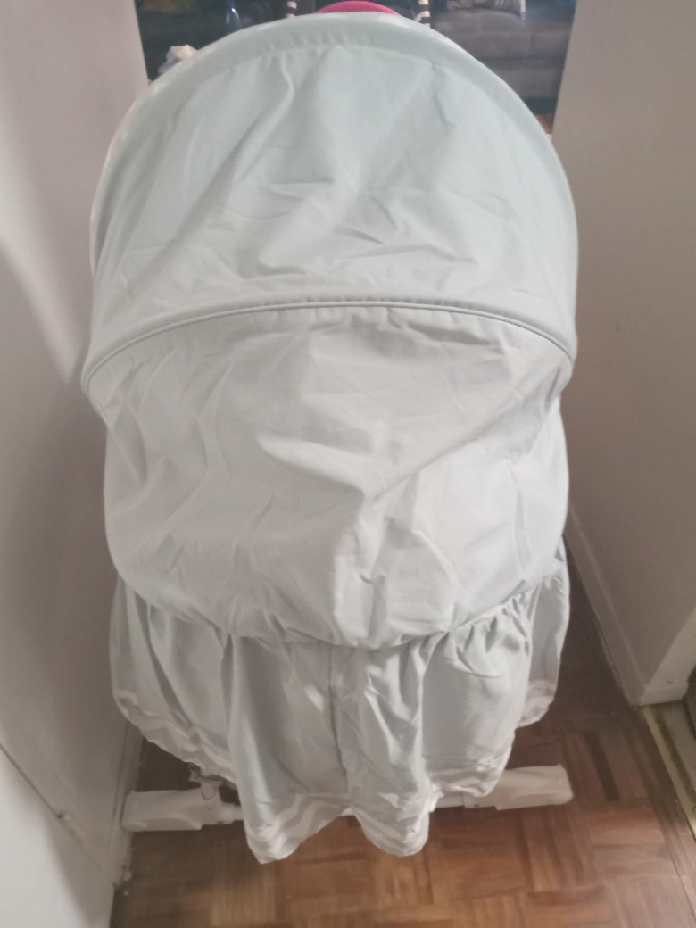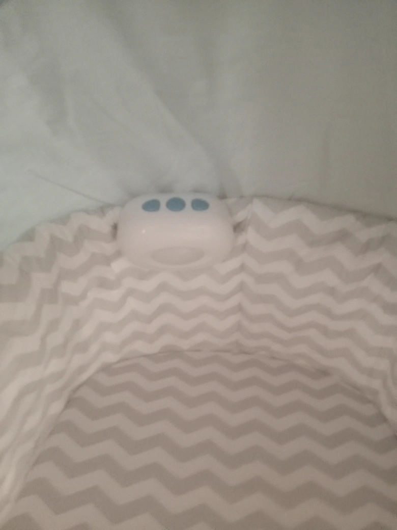 Grey and white chevron pattern. Includes canopy, storage basket, and vibration feature. Gently used.0-9mth.