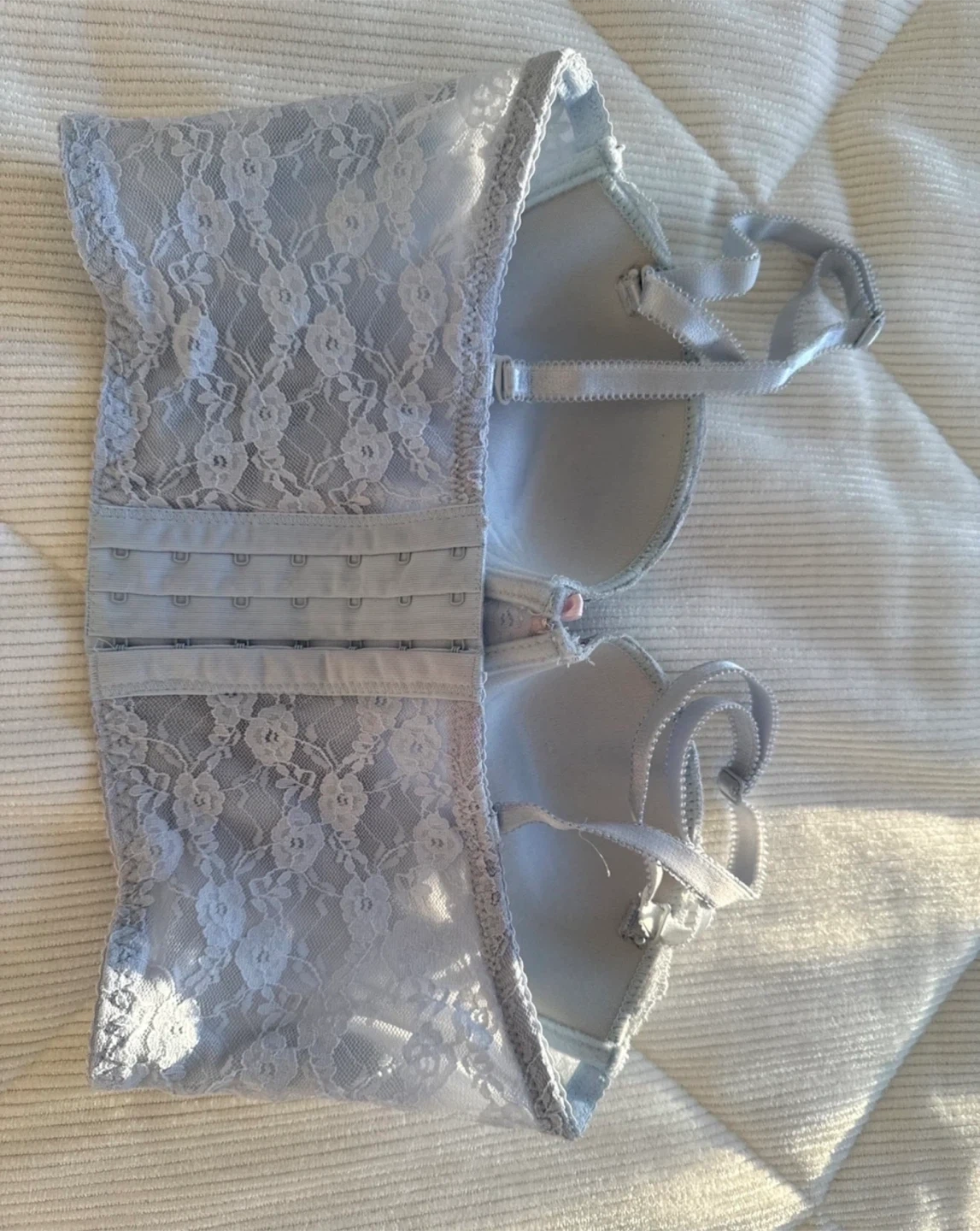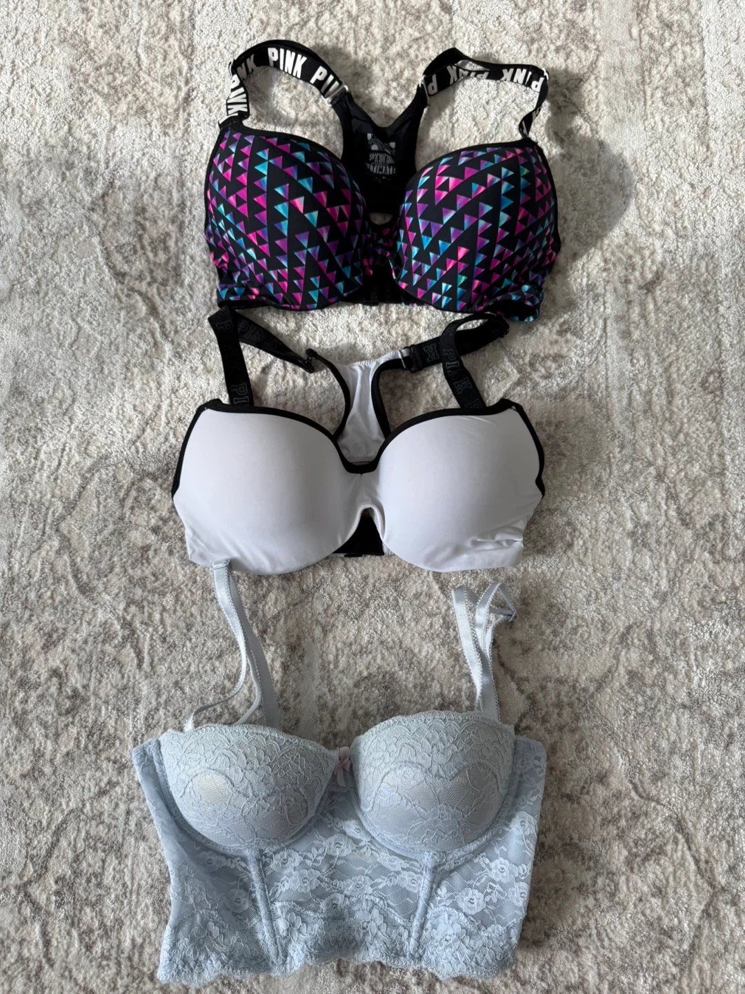 This lot includes a PINK Victoria's Secret sports bra with a triangle print, a white bra, and a blue lace bralette. The PINK bra features "PINK" lettering on the straps. The lace bralette has a corset-style design. You can take them all for 50$