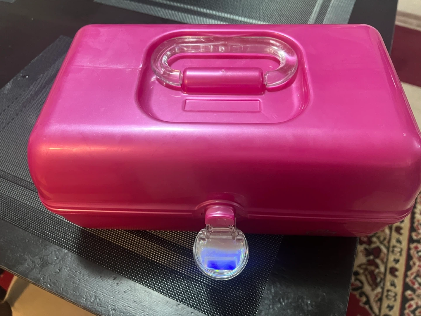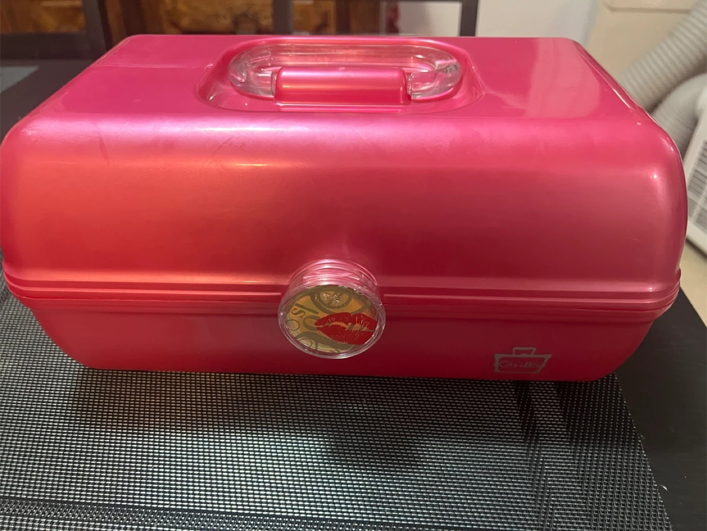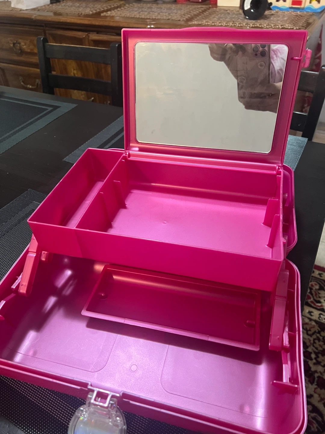 This is a pink sparkle train case perfect for makeup or art supplies. It has a built-in mirror and multiple compartments for organization. Durable plastic construction.