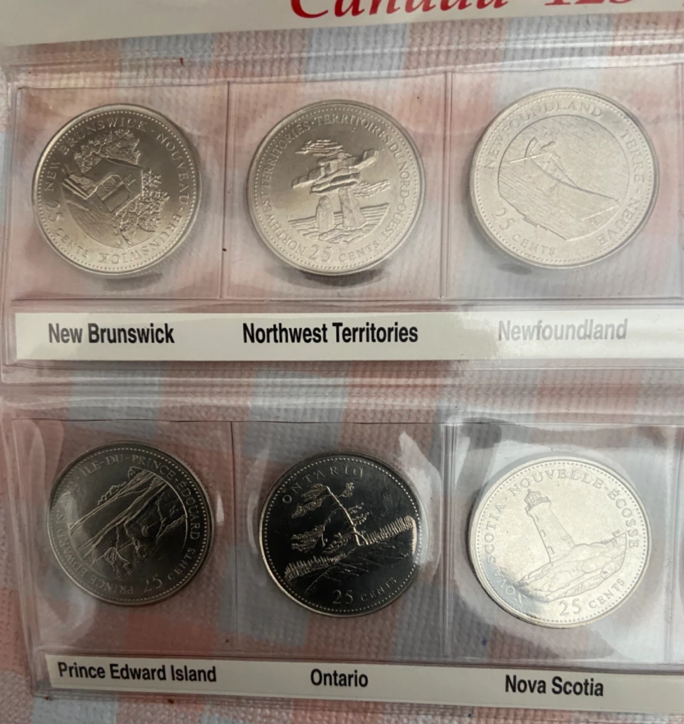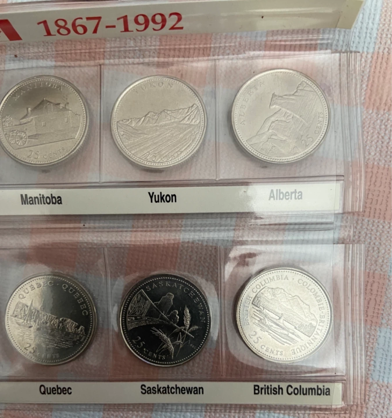 This collection features Canadian quarters from 1867-1992, celebrating Canada's 125th anniversary. Each coin represents a different province or territory. The set includes coins from New Brunswick, Northwest Territories, Newfoundland, Manitoba, Yukon, Alberta, Prince Edward Island, Ontario, Nova Scotia, Quebec, Saskatchewan, and British Columbia.