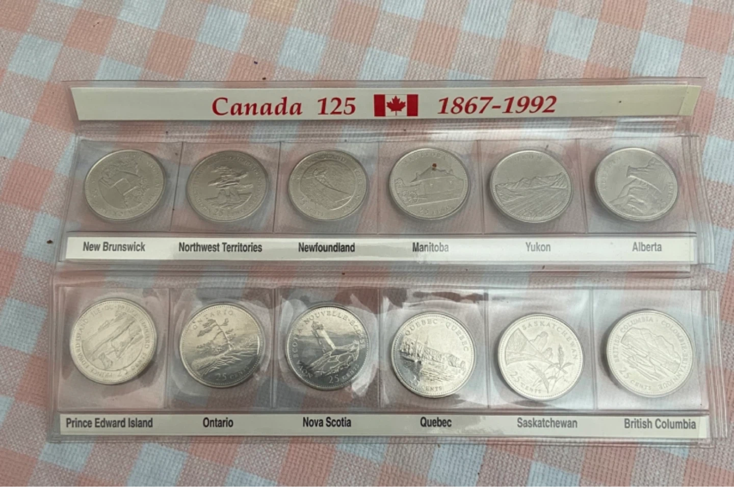 This collection features Canadian quarters from 1867-1992, celebrating Canada's 125th anniversary. Each coin represents a different province or territory. The set includes coins from New Brunswick, Northwest Territories, Newfoundland, Manitoba, Yukon, Alberta, Prince Edward Island, Ontario, Nova Scotia, Quebec, Saskatchewan, and British Columbia.