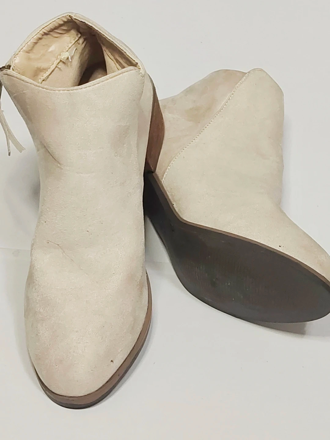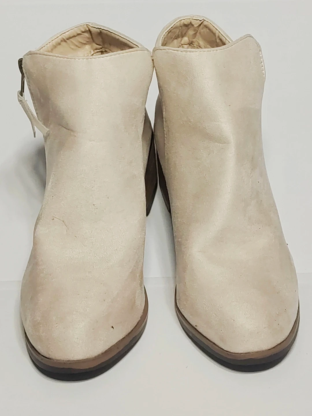 Stylish beige ankle boots from Ardene. They feature a comfortable design and a side zipper for easy wear. The material looks like suede. These boots are great for completing a casual outfit!