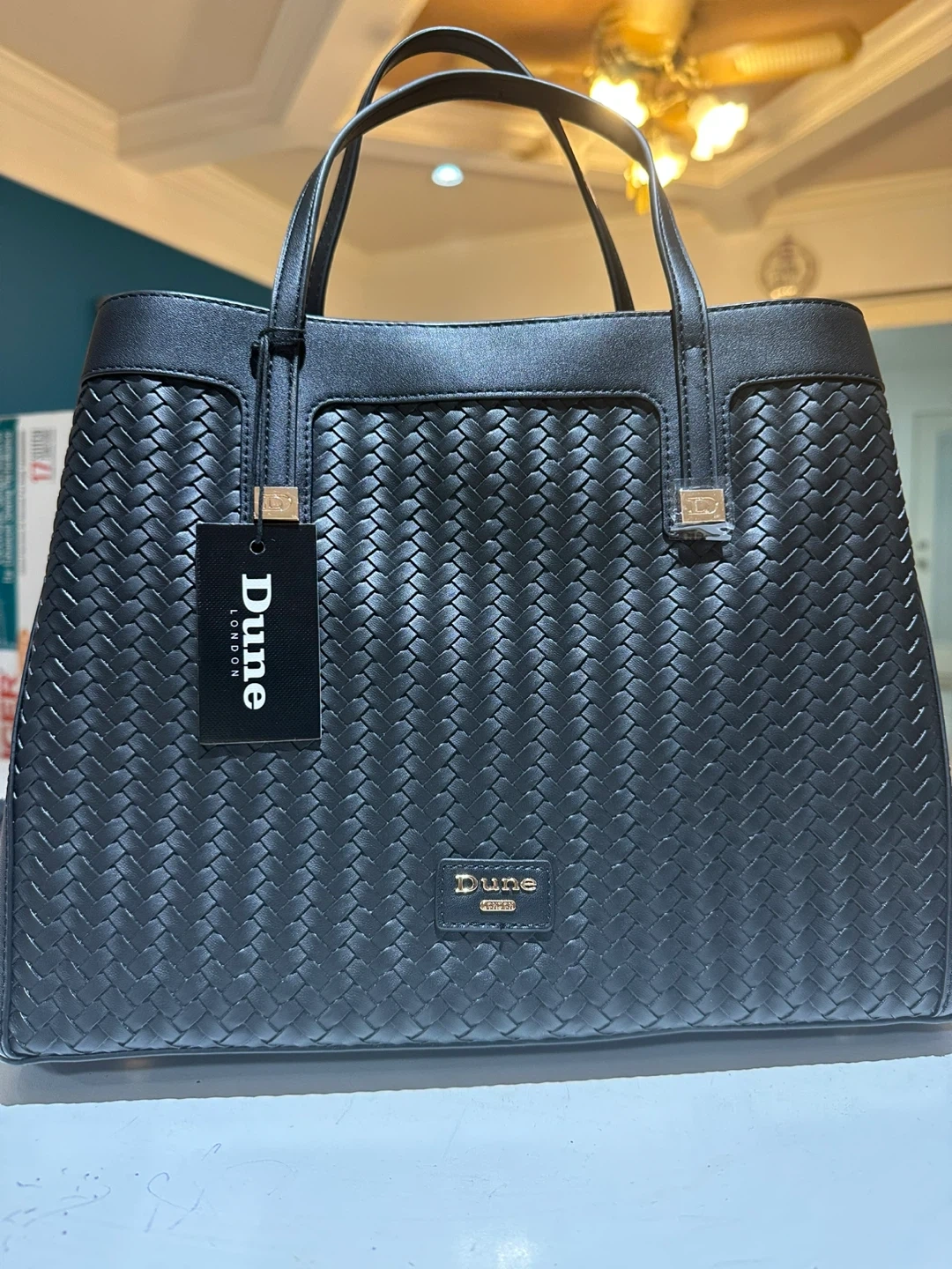 Selling a stylish black tote bag from Dune London. It has a lovely woven design on the front and back, and a smooth finish on the sides. The interior has a zippered pocket for keeping your valuables safe and organized. Perfect for everyday use!