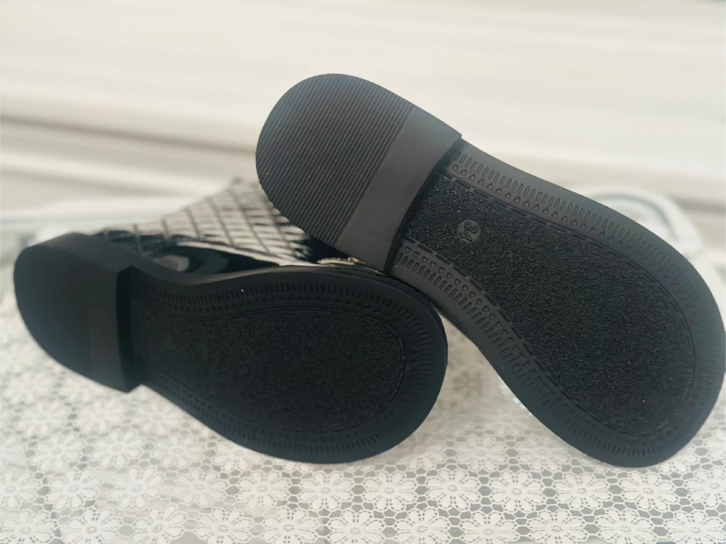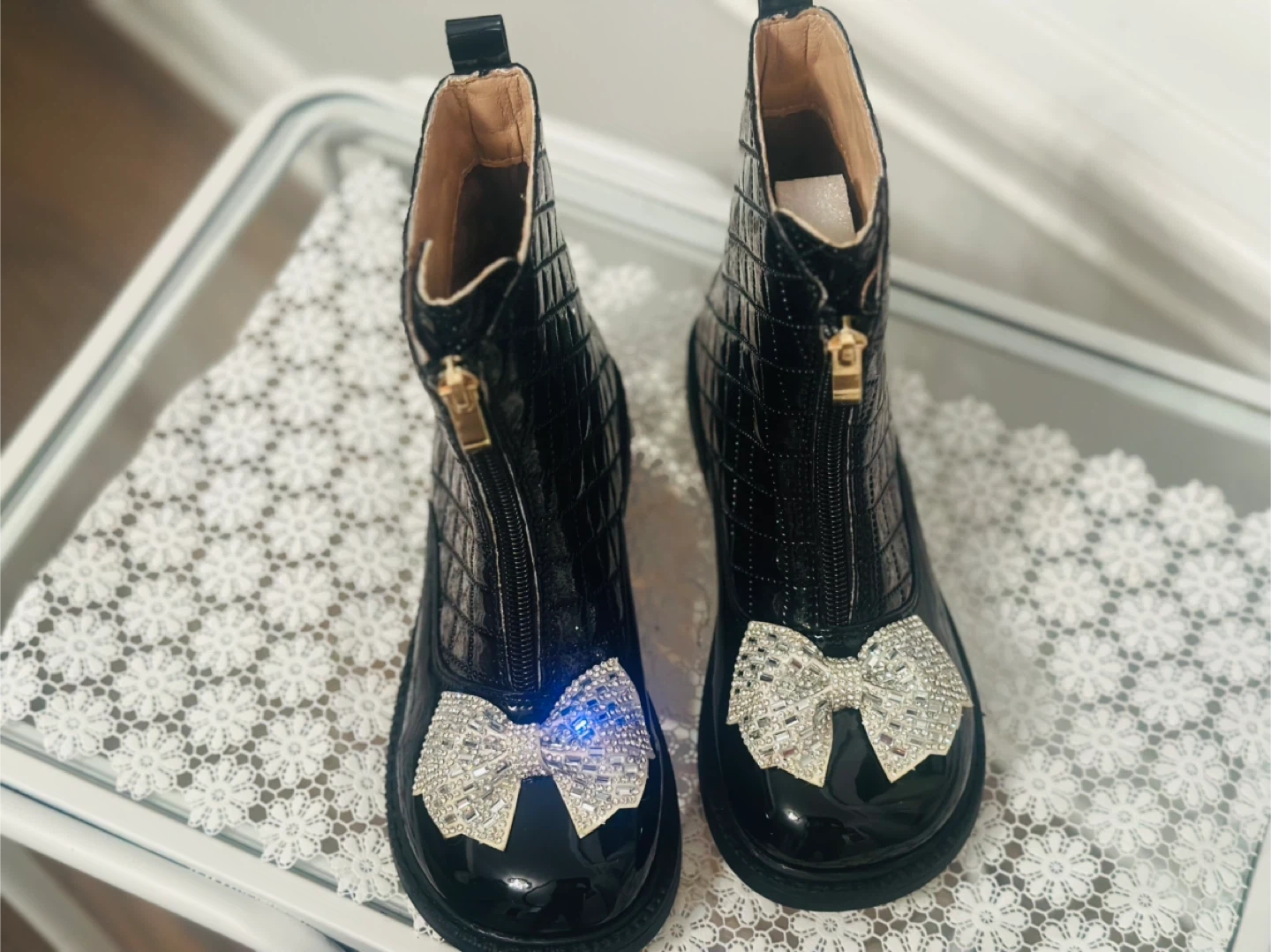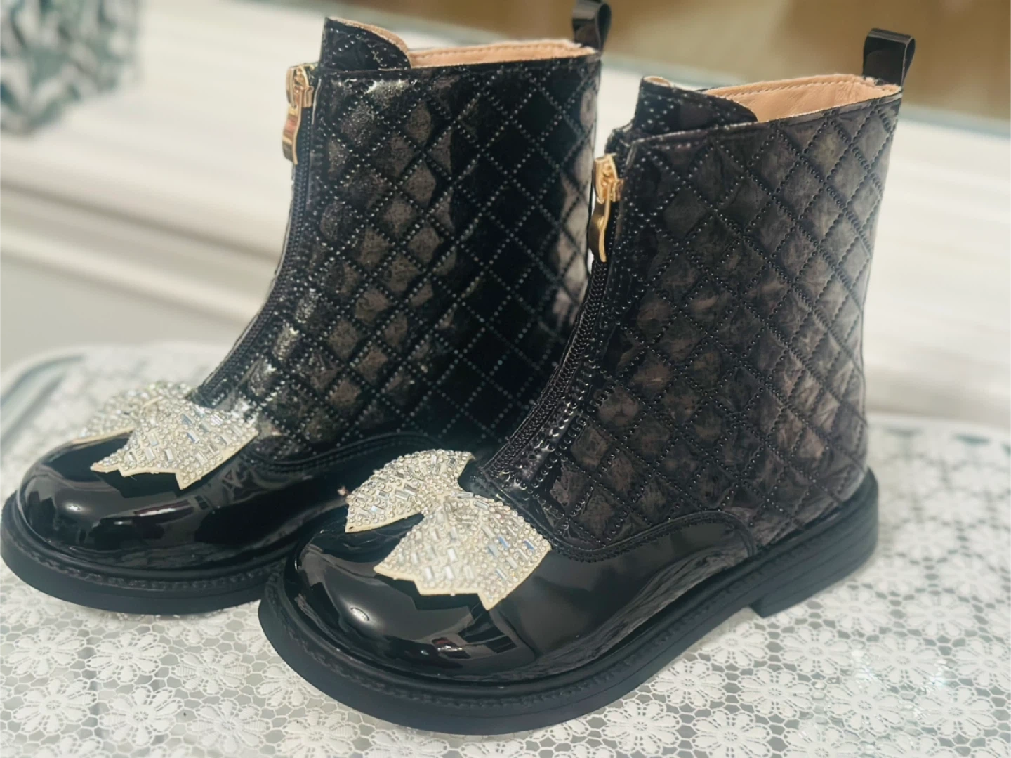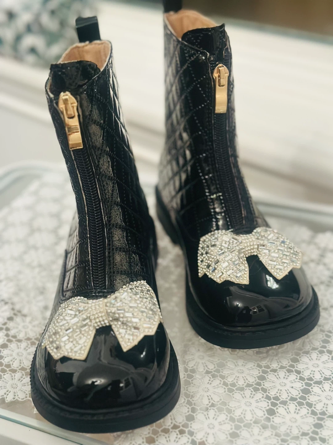 These adorable black ankle boots feature a quilted design and a sparkly rhinestone bow. They have a convenient zipper closure and are perfect for adding a touch of glam to any outfit!