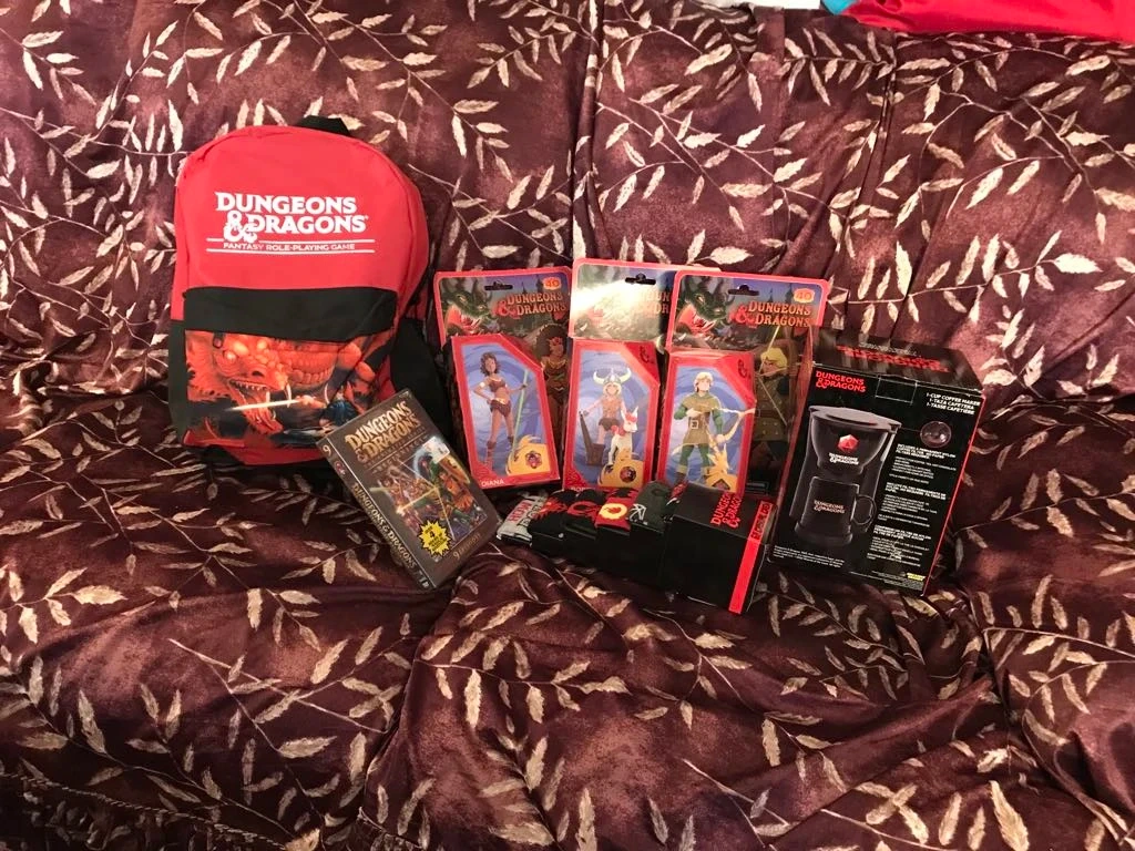 60Selling a collection of Dungeons & Dragons items! Includes a backpack, some action figures, coffee maker, cartoon DVD and D&D socks. Perfect for any fan of the game! Makes a great Christmas gift! π