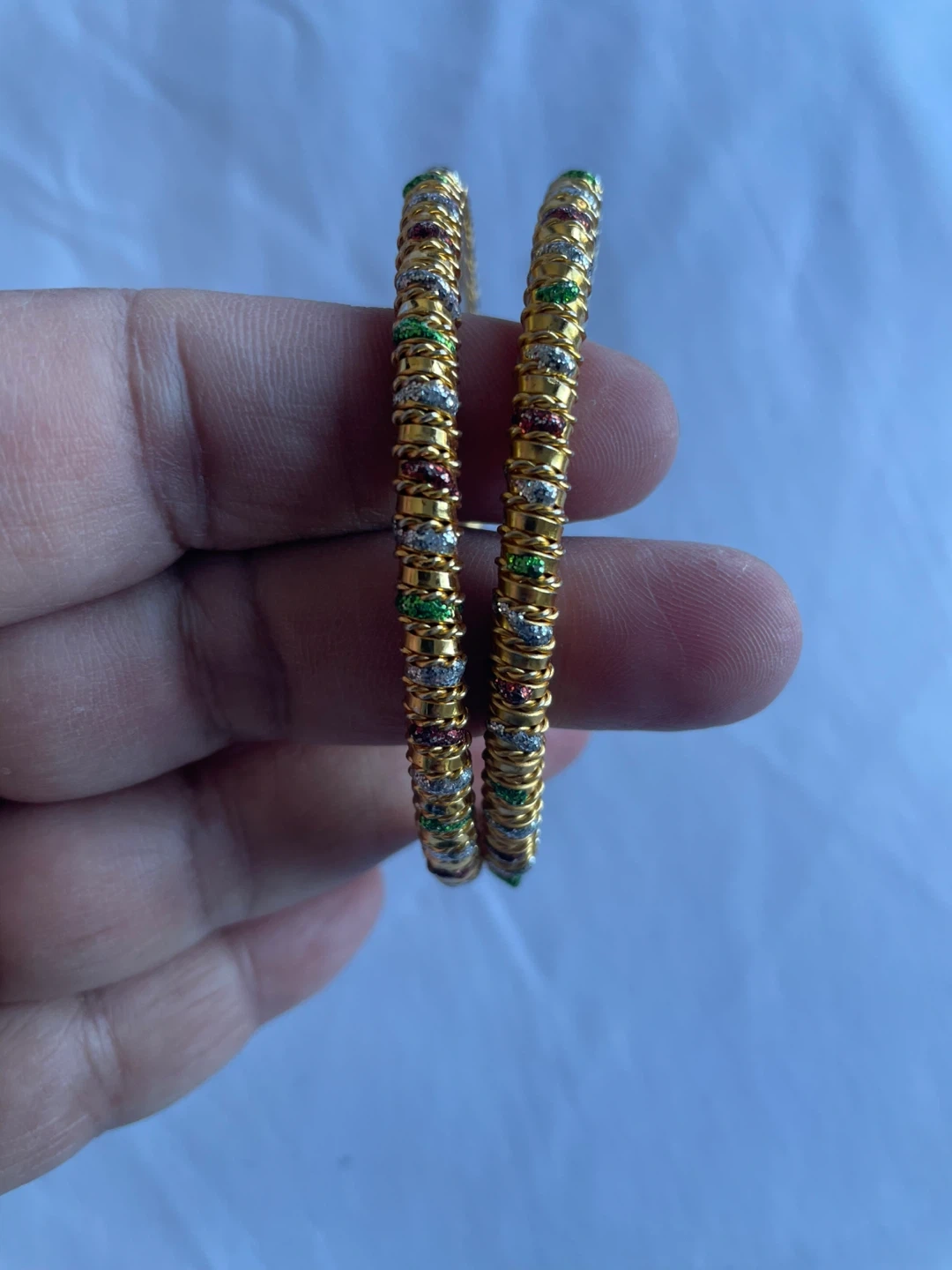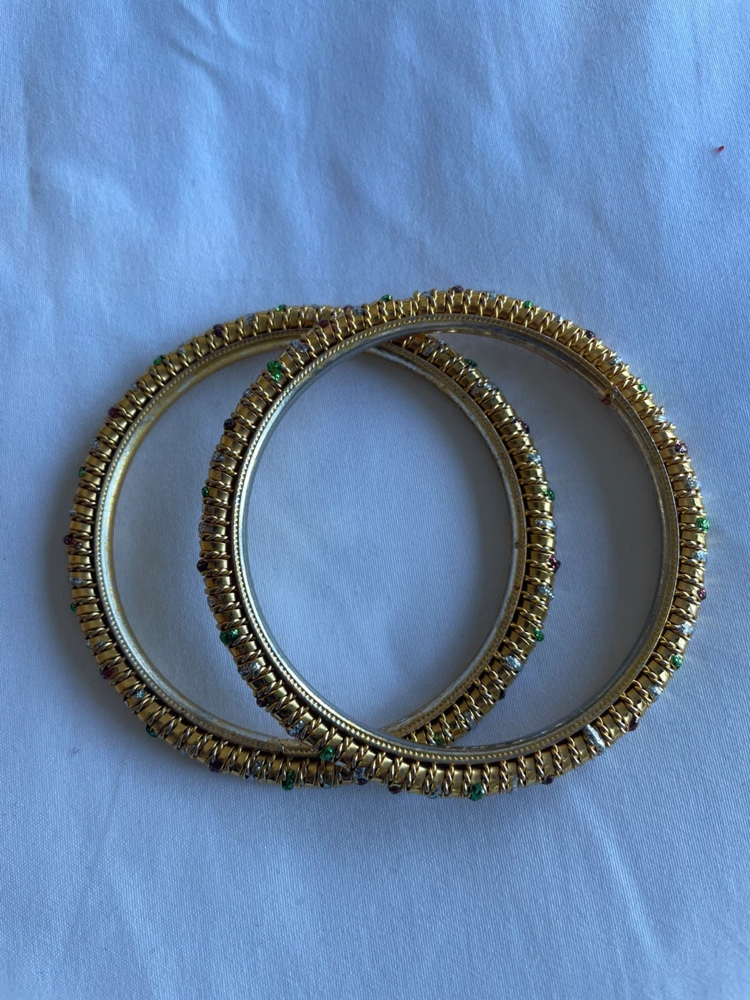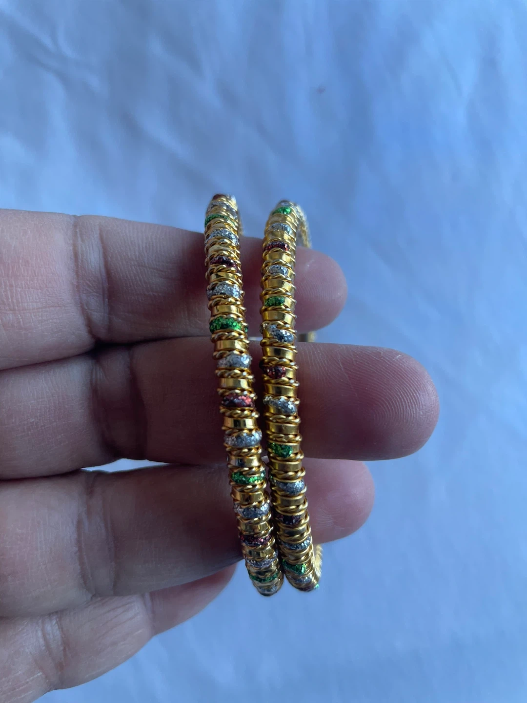 Selling a set of gold bangles, perfect for adding a touch of elegance to any outfit! They feature colourful accents that catch the light beautifully.